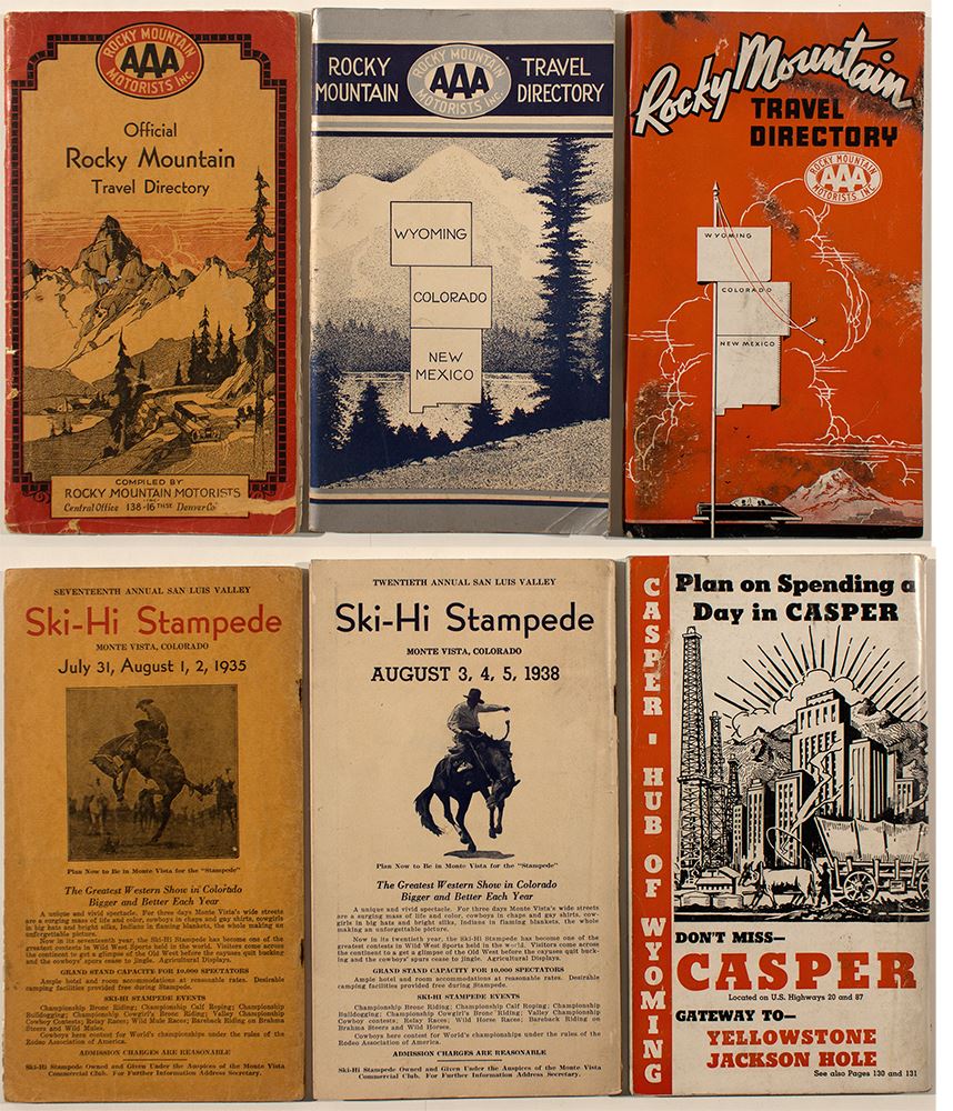 Three AAA travel directories for Colorado, Wyoming, and New Mexico. 1) 1935. 66 pages of what to see and do in the Rocky Mountains. 2) 1938. 98 pages. 3) 1947. 100 pages. They all measure 9 x 5". All contain events, ads, interesting tidbits, parks, fishing, cities,