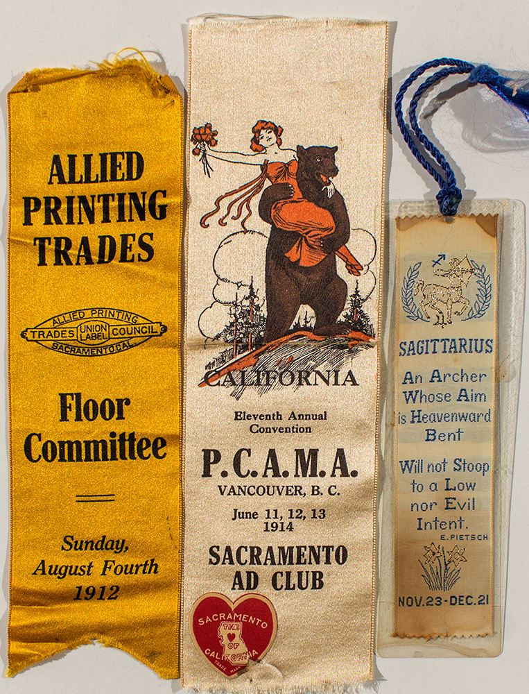 1) Allied Printing Trades Floor Committee ribbon. Sunday, August Fourth, 1912. Yellow with black text. 7.75" long with unraveling along top edge. 2) Eleventh Annual Convention for P.C.A.M.A. in Vancouver, B.C., June 11-13, 1914. Sacramento Ad Club. Great vignette of bear carrying a woman in an orange dress with trees in the background. Red heart on the bottom that says "Sacramento, the (heart) of California." 8.5" x 2.5" with slight unraveling. 3) Small ribbon for Sagittarius. "An Archer Whose Aim is Heavenward Bent/ Will not Stoop to a Low nor Evil Intent." E. Pietsch. Nov. 23-Dec. 21. Blue string attached. Glued to a piece of plastic. 5.25" x 1.25"