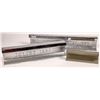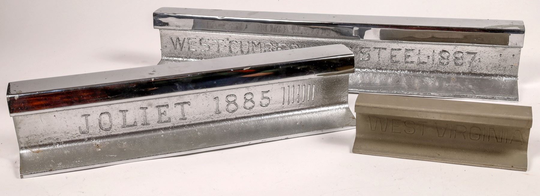 1.) 18.75" Joilet rail, 1885 2.) West Cumberland Steel 1887. 26" Long. Both rails measure 4.25" wide and 4" tall 3.) West Virginia Rail Company Narrow gauge Rail, not chrome plated, 9" long, 3" wide, 3" tall. Not dated.