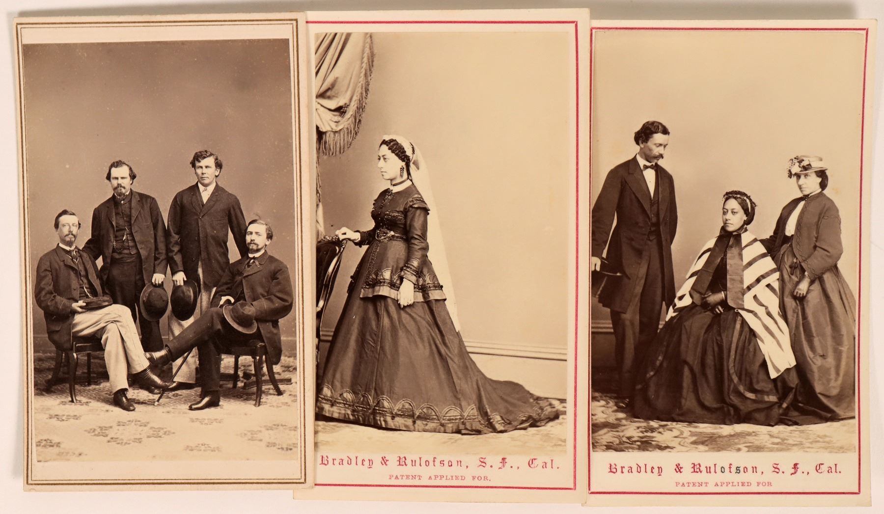 Nice group of CDV's by S.F. photographers. Two are photographs by Bradley & Rulofson, and the female subjects are in fancy gowns and the male subject is in a tuxedo. Includes a CDV of four gentleman stamped by Silas Selleck.
