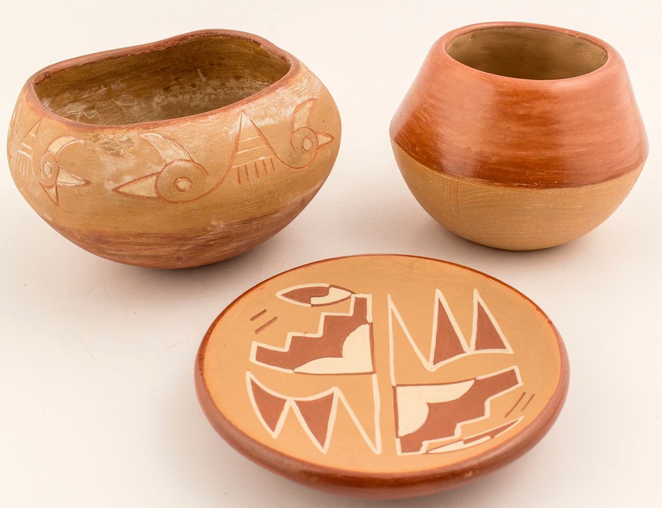 1) Small plate by Rosita Cata (Ohkay Owingeh), c 1975. Kiva, cloud and lightning designs, 1" h x 5.25" diameter. 2) Polished and sgraffito jar by Dominquita Sisneros. Lower half is micaceous clay in the sgraffito (c. 1978). 3.5" h x 4.75" diameter. Both these pieces are in great condition. 3) Ohkay Owingeh, c. 1937. Unsigned, round bowl, square opening, etched bird and raincloud designs. 3.5" h x 6" diameter, used. Date: Location: San Juan Pueblo, New Mexico HWAC # 52733