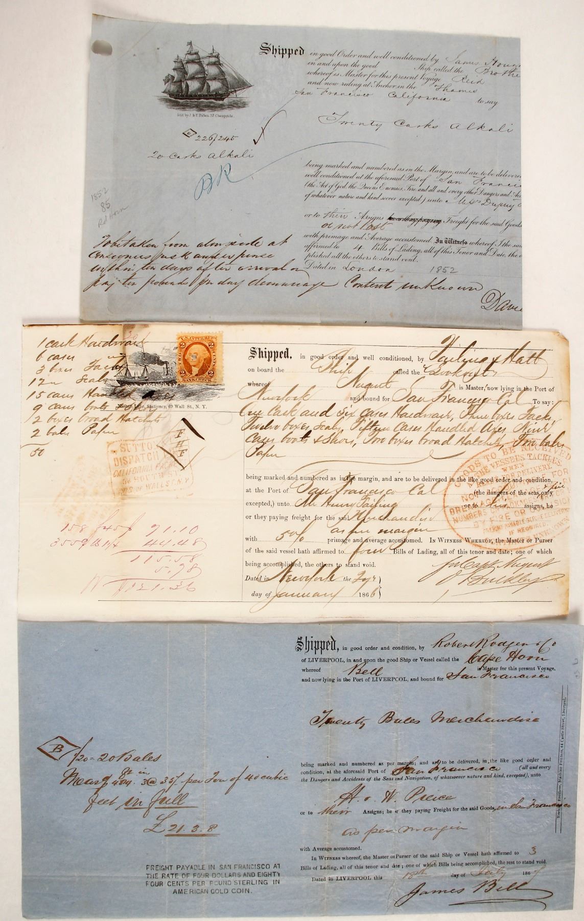 The ship Brother mastered by Reid. Anchored in the Thames. Heading to San Francisco. This is forty twenty cases of alkali. 2) Ship Lookout mastered by August. Anchored i New York. Contains axes, shoes, scales, boots, hardware, etc. Lookout made 16 passages to San Francisco between 1854 and 1871. Her fastest was 108 days. On three voyages she met with unfavorable weather, her slowest trip being 157 days; however, her remaining 13 passages averaged 121 days, a very respectable showing. 3) Ship Cape Horn mastered by Bell. 1867. For twenty bales of Merchandise. Leaving from Liverpool. (Potter Collection)