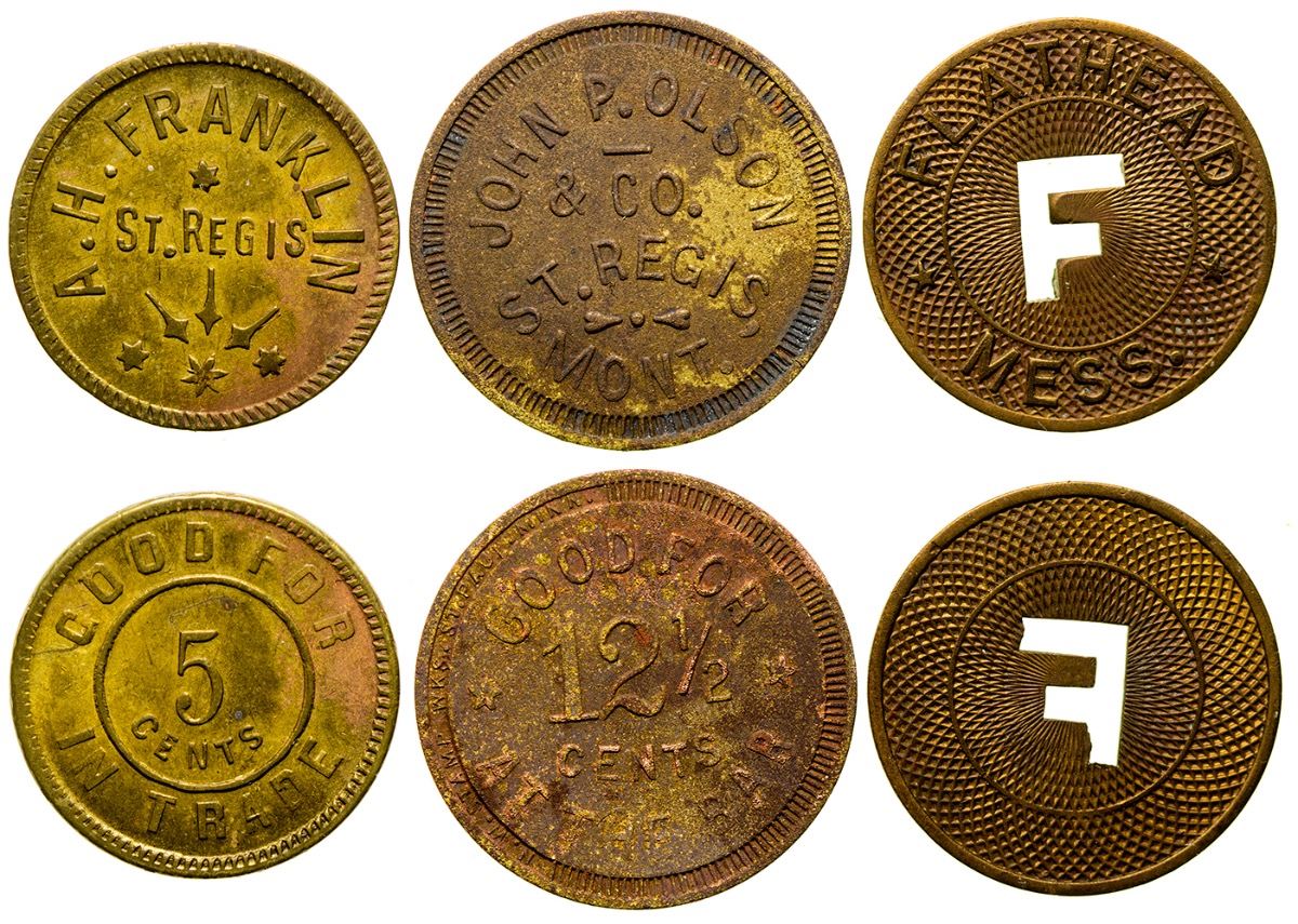 1) R-8. John P. Olson / & Co. /St. Regis / Mont. // GF / 12 1/2 / Cents / IT. Brass, round, 24mm, very worn. 2) R-7. A. H. Franklin / St. Regis // GF / 5 / Cents / IT. Brass, round, 21mm. 3) Flathead / cut-out of letter "F" / Mess. Construction Company. St. Mary's. Brass, round, 23mm. (Svoboda Collection) City: St. Regis State: Montana Date: HWAC# 35013