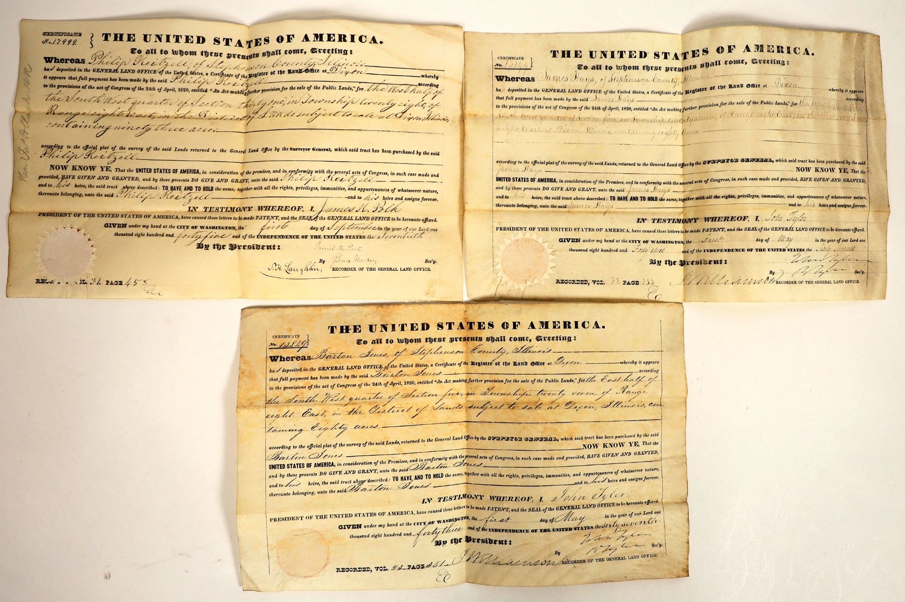 Lot of 3 General Land Office patents for Stephenson County, Illinois issued 1843-45. All are signed by secretaries for the president (two for John Tyler, one for James Polk). All are 10 x 16" Stephenson County, Illinois, organized in 1837, spent the 1840s transforming from raw prairie into a settled farming region, with Freeport emerging as the county seat and commercial hub. The decade saw rapid population growth, especially from German immigrants, and the spread of farms, mills, schools, and churches that anchored permanent communities. Agriculture-particularly wheat and livestock-dominated the economy, with roads linking the county to Galena, while railroads would not arrive until the following decade.