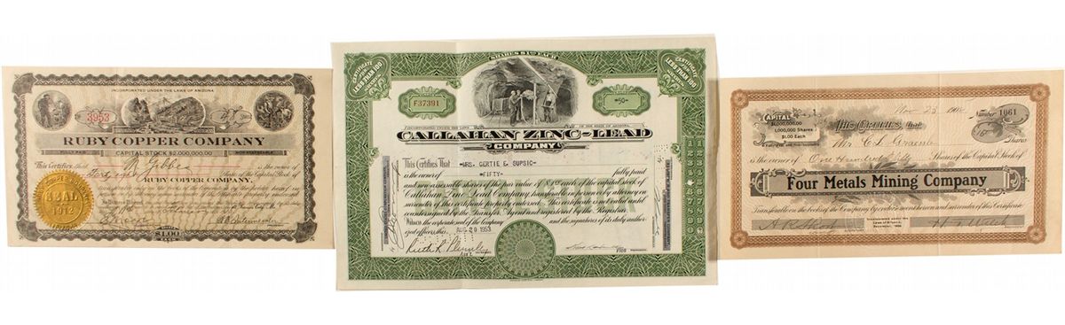 Three different Patagonia district mining stocks. 1)Ruby Copper Company (AZ), issued in 1910. Small size certificate. Unc. 2)Four Metals Mining Company (AZ), issued in1908. Small size certificate. Operated at Washington, Santa Cruz County. Unc. 3)Cal lahan Zinc-Lead Company (AZ), issued 1953. Operated at Patagonia (Garbani). Unc.City: PatagoniaCounty: Santa CruzState: AZDate: