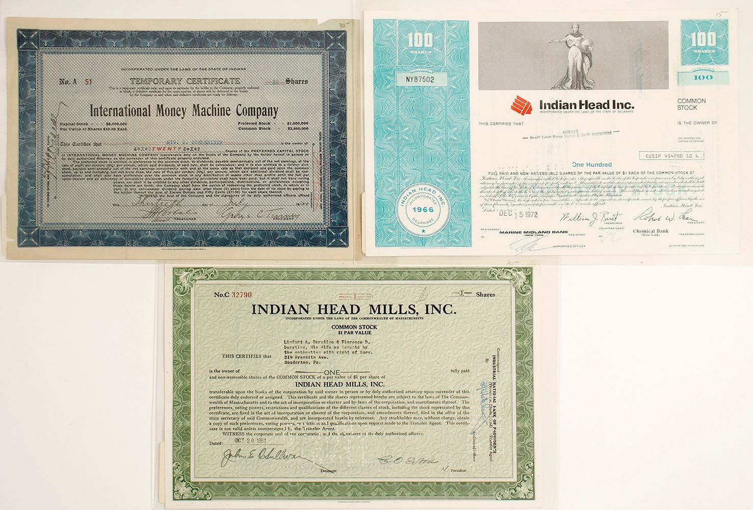 1) Indian Head Mills, Inc. Issued 1961 for one share, punch cancelled. 2) Indian Head, Inc. Issued in 1972 for 100 shares. Punch cancelled. 3) International Money Machine Company. Temp. certificate issued in 1920 for 20 shares. (Al Adams Gold Rush Memorabilia Collection) HWAC# 60047 Date: 1920-1972 Location: