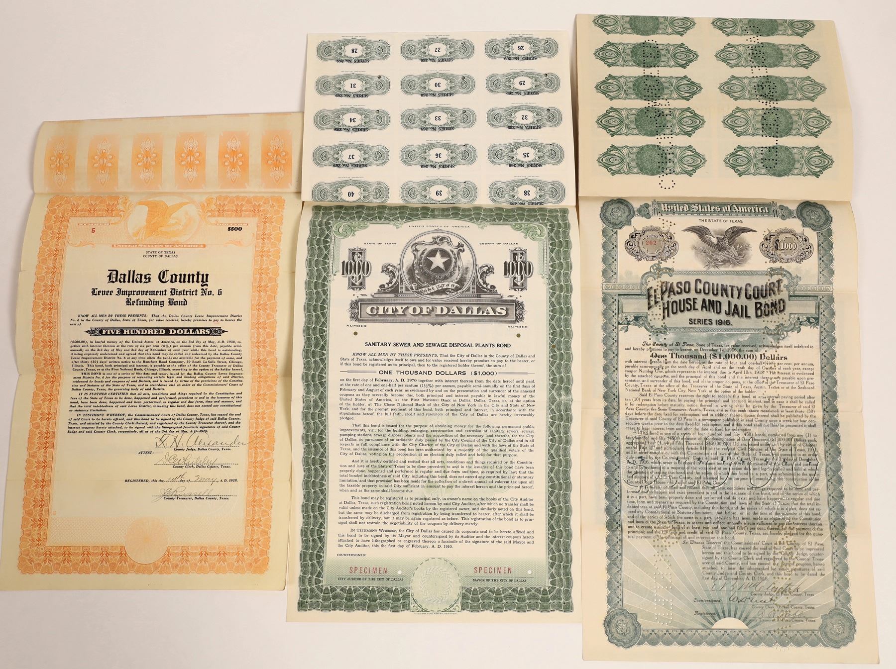 1) Dallas County Levee Improvement Refunding Bond. 1923. NUMBER 5. Coupons 7-20 attached (taped). Signed by TH Alexander county judge county clerk and J Russell treasurer. 2) El Paso Court House and Jail Bond. Number 262. 1916. Coupons 22 to 62 attached. Cancelled. 3) City of Dallas Sanitary Sewer and Sewage Disposal Bond. Specimen. 1950. Overall these are in very nice condition.
