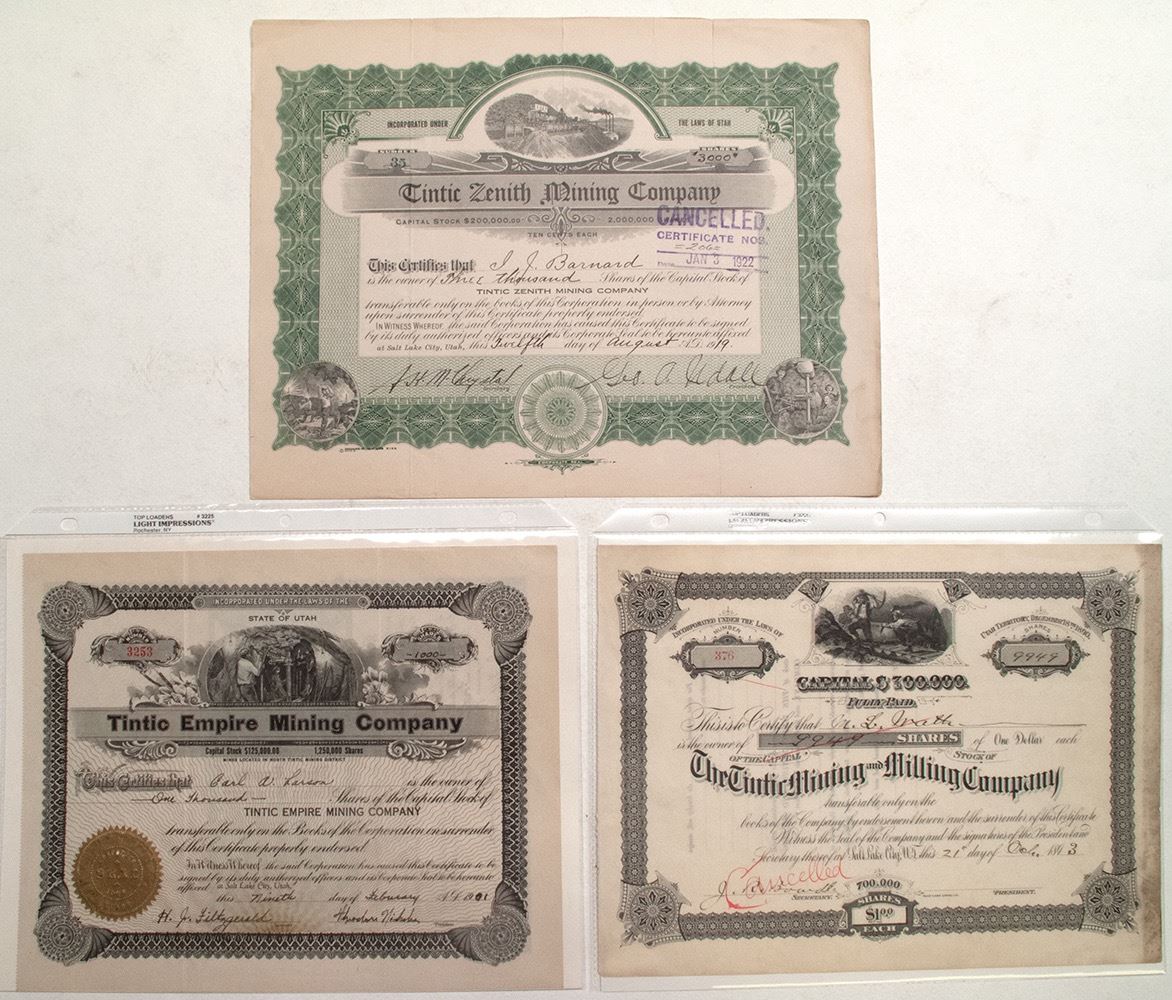 1) Tintic Mining and Milling Company, #376, 9,949 shares, 1893, no president's signature. 2) Tintic Empire Mining Company, #3253, 1,000 shares, 1901. 3) Tintic Zenith Mining Company, #35, 3,000 shares, 1919. City: Tintic Mining District State: Utah Date: 1893-1919 hwac# 8926