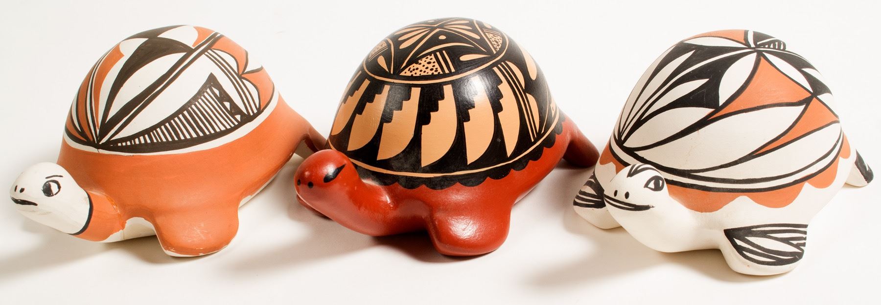 Three Turtles: 1) N. Guni, 1983. Laguna Pueblo. 6" x 2.75" x 4" turtle. 2) Dora, Isleta Pueblo, 6" x 2.75" x 4" turtle. 3) Unknown artist, 6" x 2.75" x 4" turtle. State: New Mexico City: HWAC#: 48177 Date: