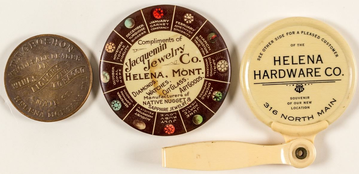 All unlisted. 1) 2.25" diameter. Compliments of / Jacquemin Jewelry Co. / Helena, Mont. / Diamonds, Watches, Cut Glass, Art Goods / Manufacturers of / Native Nugget & Sapphire Jewelry. Ad in center, surrounded by color pictures of flowers and months and meanings they represent. Good Condition. 2) Ivory colored ad mirror, 2" diameter, with fold-out handle. See other side for a pleased customer / of the / Helena Hardware Co. / Souvenir of our new location / 316 North Main. Very good condition. 3) Metal advertising mirror, 1.5" diameter. T. N. Groshon / Wholesale Dealer in / Wines, Liquors and Tobacco / Main St. / Helena, Montana. Mirror side is cracked and worn. (Svoboda Collection) City: Helena State: Montana Date: HWAC# 33837