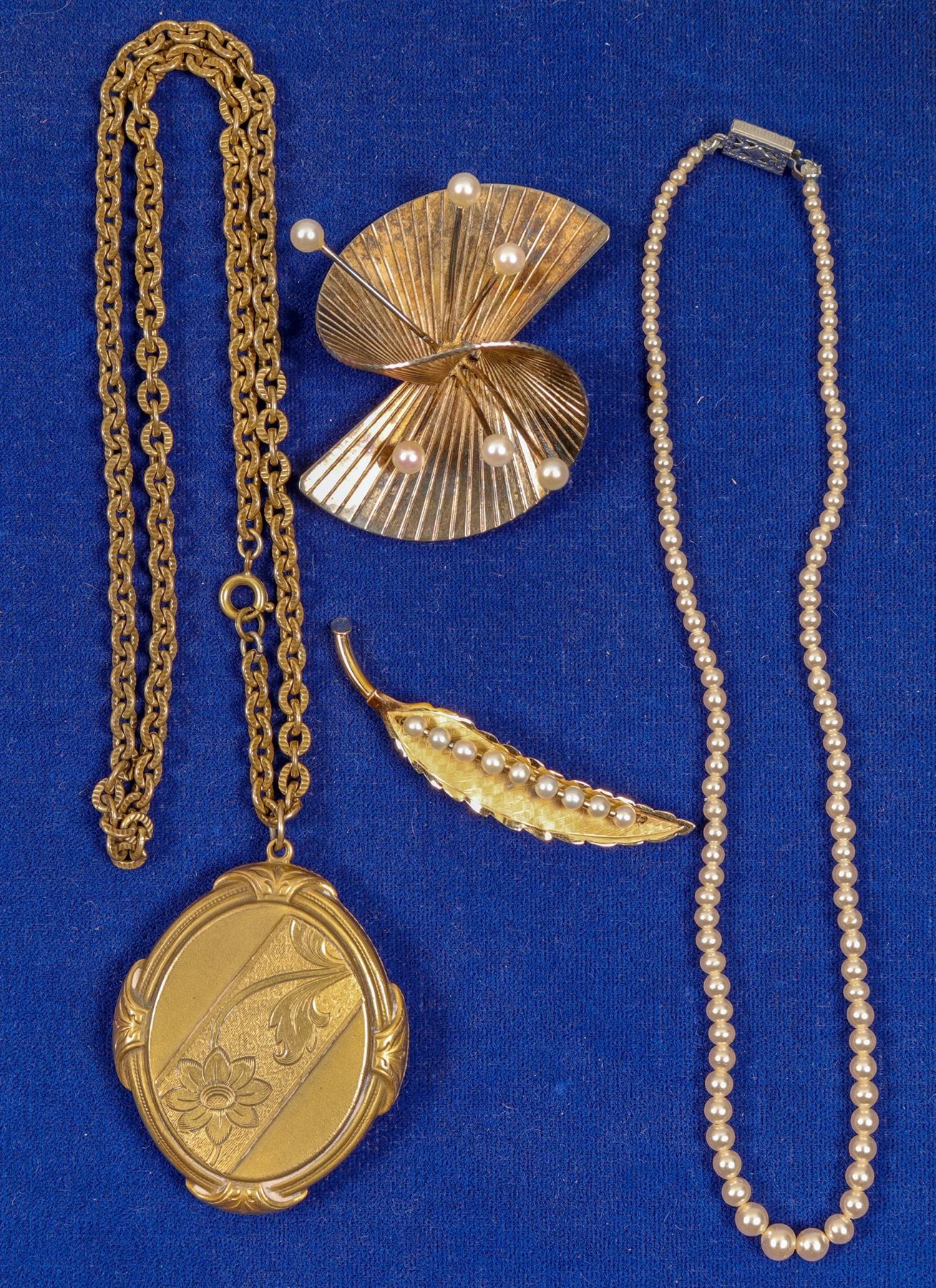 1) Leaf pin with pearl insets. 2) Wicked large pion. 3) Pearl type bracelet. 4) Heavy duty locket necklace. See photo.