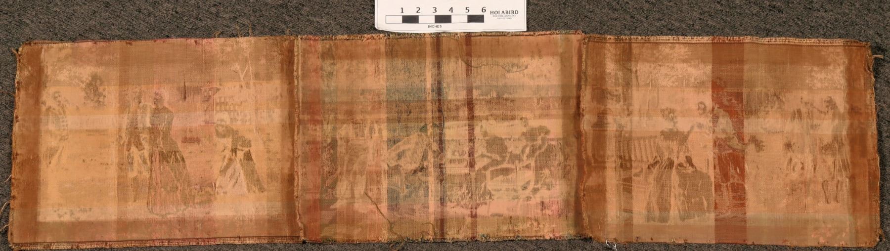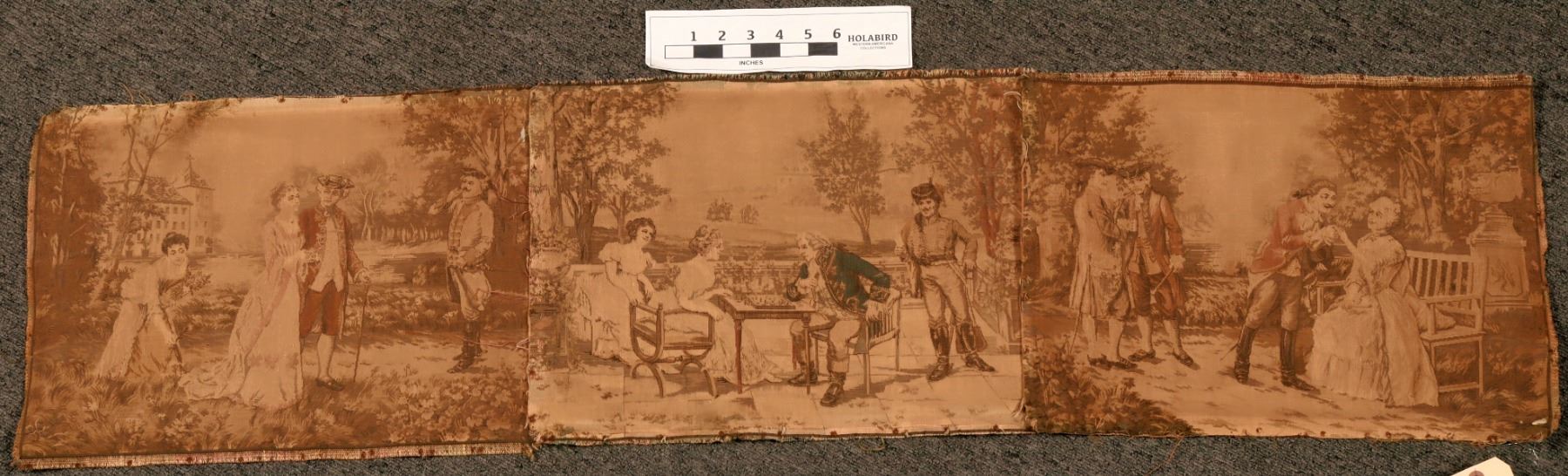 The three tapestries are stitched together. They are sepia toned or very faded. A military person appears in all three pieces. The pieces appear to be French, post 1900's. Approx. 50" x 12".