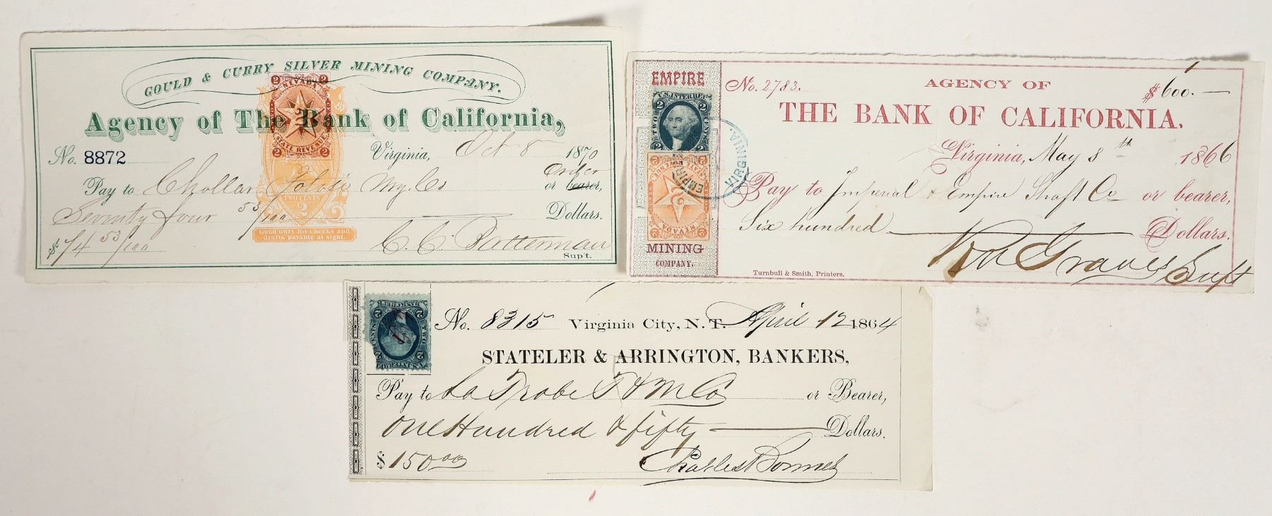 Lot of three different. 1) 1864 territorial Stateler & Arrington check issued from the Gould & Curry to Latrobe Tunnel & Mining Company, signed by Charles Bonner. 2) 1866 Empire Mill & Mining Co. issued to Imperial & Empire Shaft Company, signed by RN Graves. Orange NV and US IR adhesive. 3) 1870 Gould & Curry issued to Chollar Potosi Mining Co. with rare RN-B17b, signed by Batterman as supt., endorsed on back by Requa.