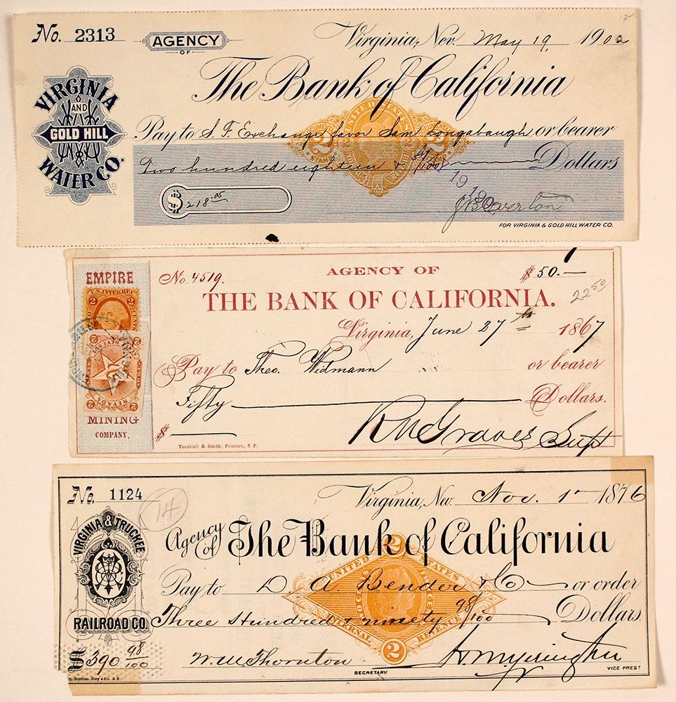 Lot of 3 different. 1) Virginia & Truckee Railroad Company. Bank of California. Issued to D.A. Bender (Reno banker). Nov. 1, 1876. RN-G1 Revenue printed stamp. Signed by H. (Henry) M. (Marvin) Yerington. He is reported to have been president of sixteen different companies at one time and actively involved in forty. He is probably best known as the general superintendent and vice-president of the Virginia and Truckee Railroad and as a construction superintendent and president of the Carson and Colorado Railroad. Ripped lower left corner and some toning on corners. 2) Virginia and Gold Hill Water Co. – Bank of California – May 19, 1902 RN-X7 Revenue printed stamp. J. B. Overton signed. In 1871 Overton came to Virginia City to take charge of building the Virginia and Gold Hill Water works which he managed for many years at the request of the Bonanza Kings, Fair, Mackey, etc. Scarcest of the checks from this company. The two-story safes from this company were a treasure trove of Comstock documents when they were opened several decades ago. 3) Empire Mill & Mining Company. Nevada and IR adhesive revenue stamps. Issued 1867. Signed by R.N. Graves, well-known Comstock superintendent. A Gold Hill mine. Date: 1867-1902 Location: Virginia City, Nevada HWAC# 57615