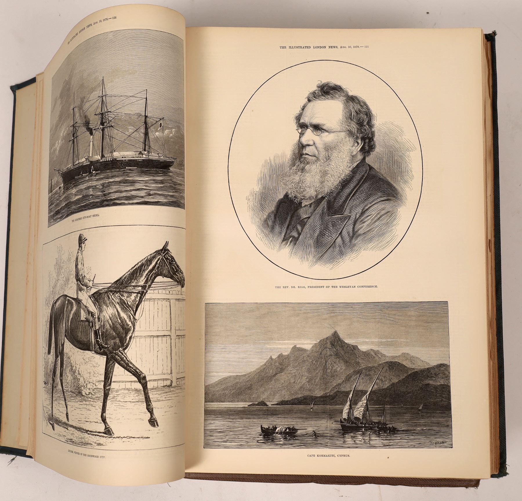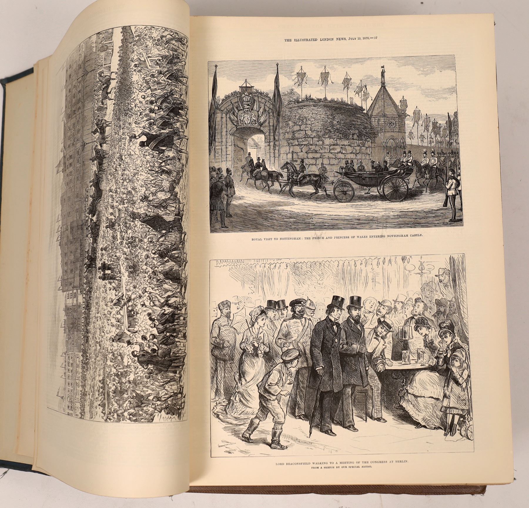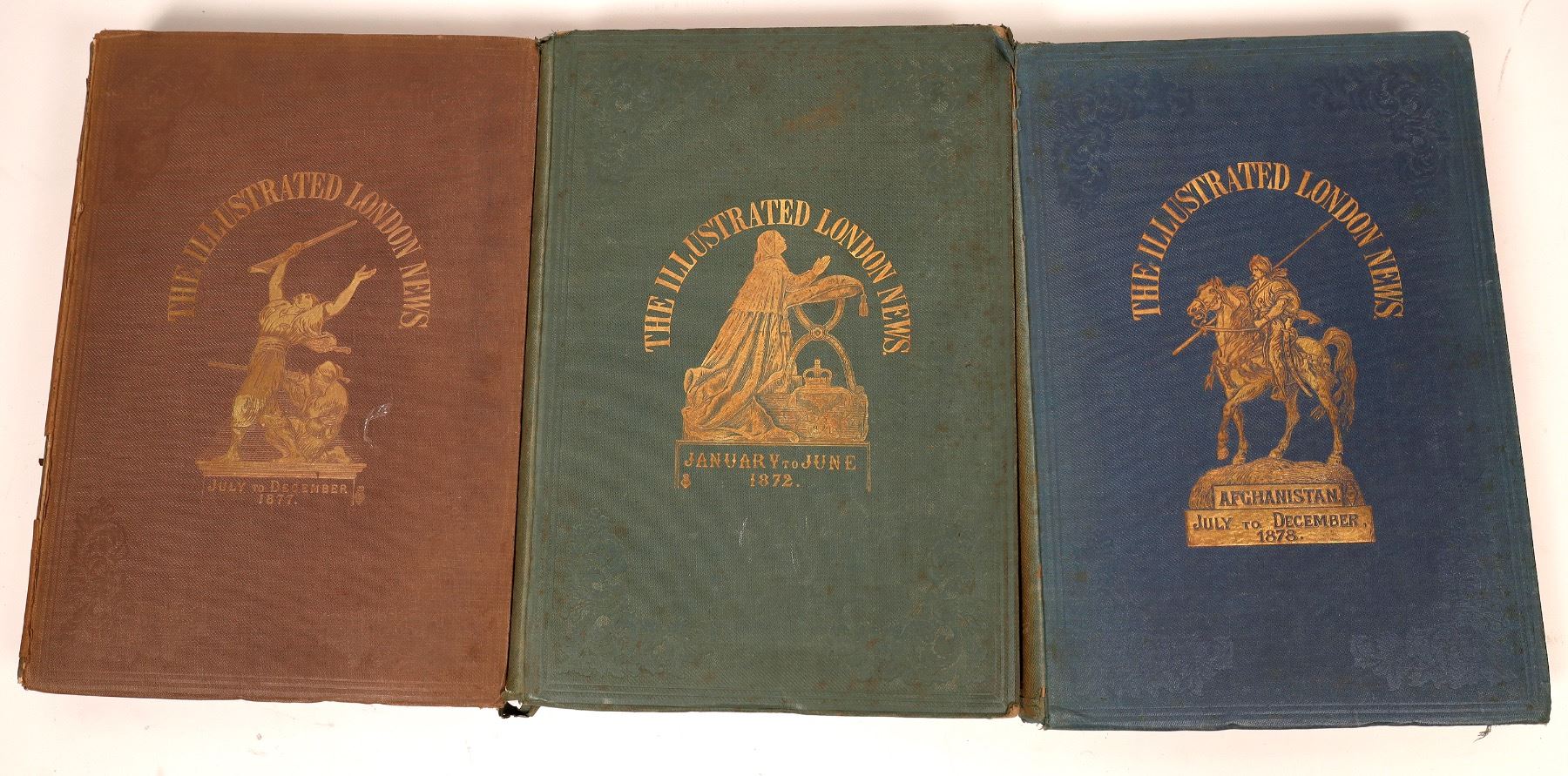 This is a trio of hardbound copies of "The Illustrated London News." Volumes consist of Volume #60, January-June 1872, Volume #71, July-December 1877 and Volume #73 July-December 1878. "The Illustrated London News" appeared weekly until 1971, then less frequently thereafter, and ceased publication in 2003. The company continues today as Illustrated London News Ltd, a publishing, content, and digital agency in London, which holds the publication and business archives of the magazine. These are big, coffee table type books that are a little ragged around the edges, but no apparent bindery issues. Please see photos for more detail and condition.