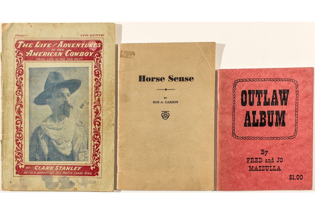 1) "Outlaw Album" by Fred and Jo Mazzulla. 1966. Signed by authors. 48 pages with index. Doc Holliday, Calamity Jane, Butch Cassidy and the Sundance Kid, etc. Softcover with stapled binding. 6.25" x 4.75" 2) "Horse Sense" by Bob A. Carson. 1935. 48 pages. "The secrets of breaking, training, and educating gentle, unbroken and vicious horses." Softcover with stapled binding. 7.5" x 5" 3) "The Life and Adventures of the American Cowboy. True Life in the Far West." By Clark Stanley, Better Known as the Rattle Snake King. Front cover soiled and detached. Back cover missing. Staple binding. Has some photographs. Ends with advertisements for Stanley;s Snake Oil Liniment. Pages unnumbered. 8.5" x 6"