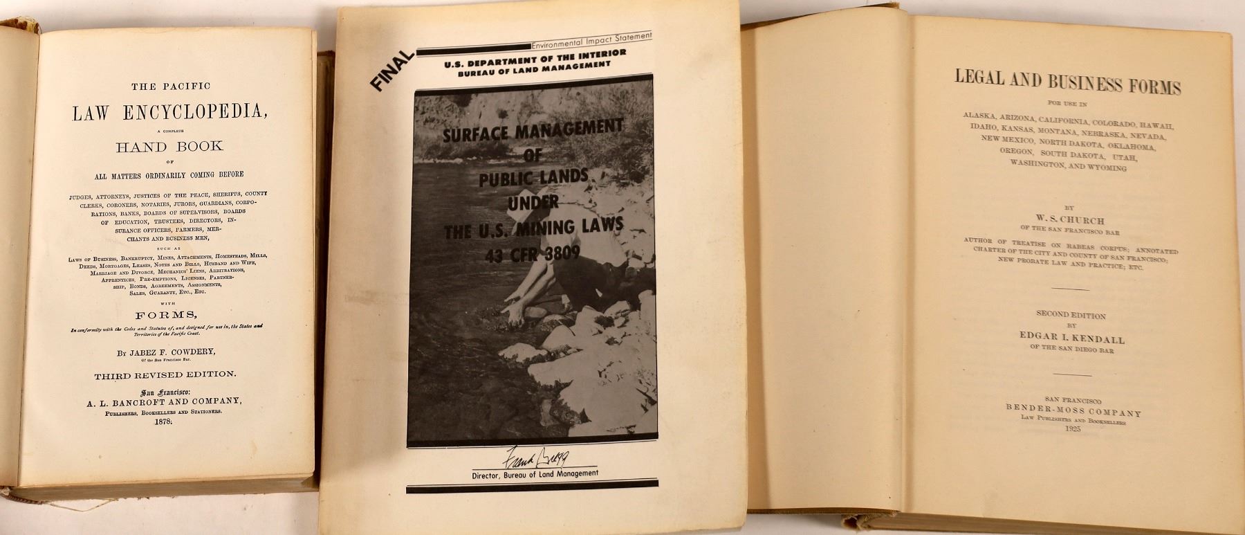 1) Pacific Law by J. F. Cowder. A Complete Hand Book of All Matters Ordinarily Coming Before Judges, Attorneys, Justices of the Peace, Farmers, Merchants and Business Men…. 2) Church’s Legal Business Forms, Western States. 3) Surface Management of Public Lands. The two older books have condition issues including spine and binding. Pages are good. (W.D. Miles Collection)