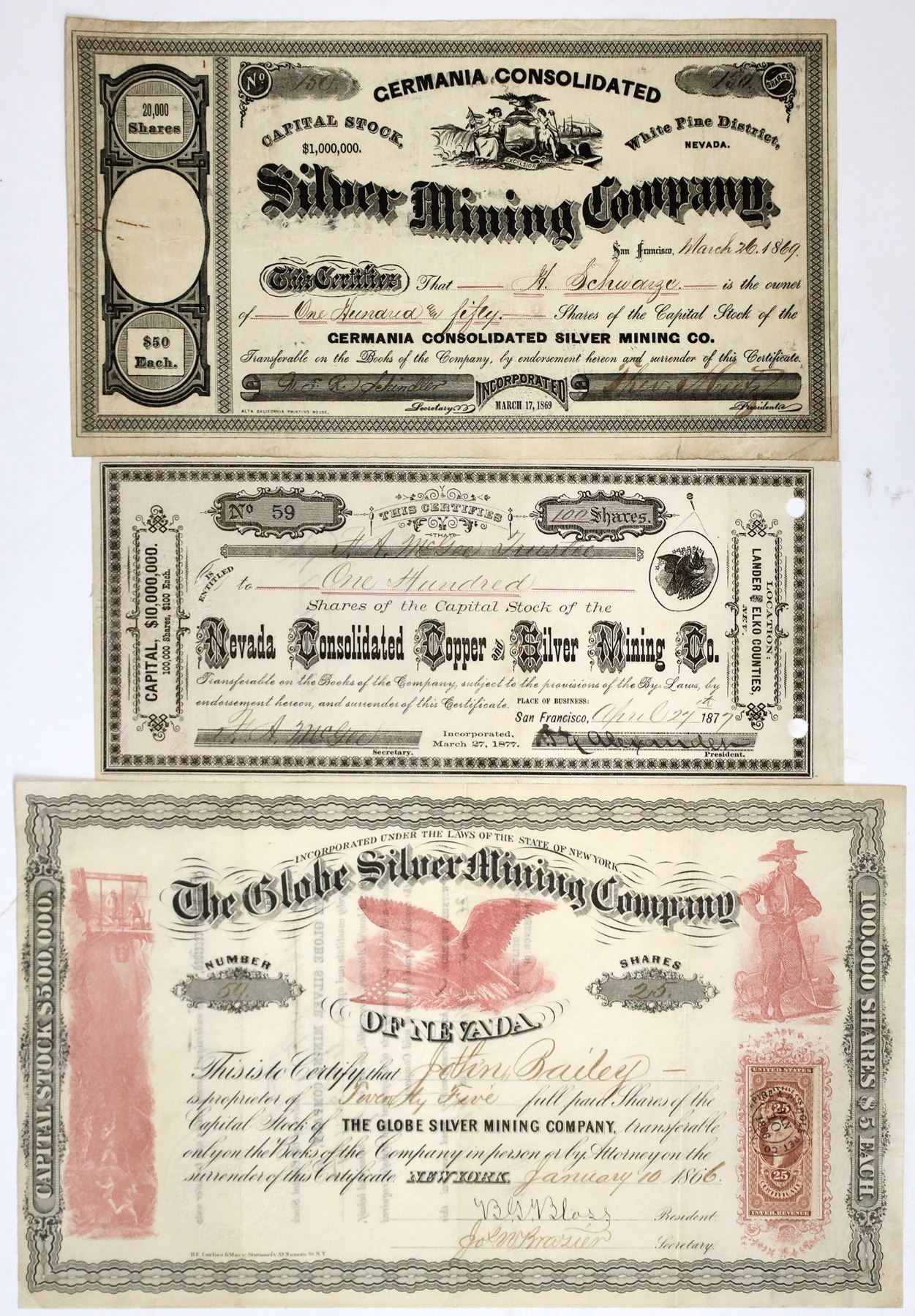 1 ) White Pine District, Nevada (printed at upper right). Incorporated March 17, 1869. 1869 was the height of the rush to White Pine. #150 for 150 shares to H. Schwarz on March 26, 1869 in San Francisco. Signed by president Theodore Meetz and secretary W. F. R. Schindler. Not cancelled. Printed by Alta California Printing House. This printer is not seen on Nevada stock certificates often, even though it was an important printing house. Incorporation and quarterly meetings were all we found about this company. 2) Inc. in New York. No. 50, issued for 25 shares to John Bailey on Jan. 10th, 1866 in New York. Signed by president BG Bloss and secretary Brazier. Not cancelled. Black border and print. Printed by Corlies & Macy. The exact location of this company is unknown. An 1875 article in the Sacramento Daily Union mentions that the "ten stamp mill of the Globe Silver Mining Company, about fourteen miles from Hiko, with dwelling house, blacksmith shop, etc. will be sold at Sheriff's sale in Pioche..." 3) # 59 for 100 shares to F. A. McGee dated April 27, 1877. Signed by F. A. McGee, trustee and secretary, and T. H. Alexander, president. Incorporated March 27, 1877. Located Lander & Elko Counties, Nev. Assessment #1 payment noted on back signed by McGee. Title in fancy script. The Virginia Evening Chronicle ran a notice saying "Location: Lander & Elko Counties." This means this was a speculative stock. Additional information as found included.