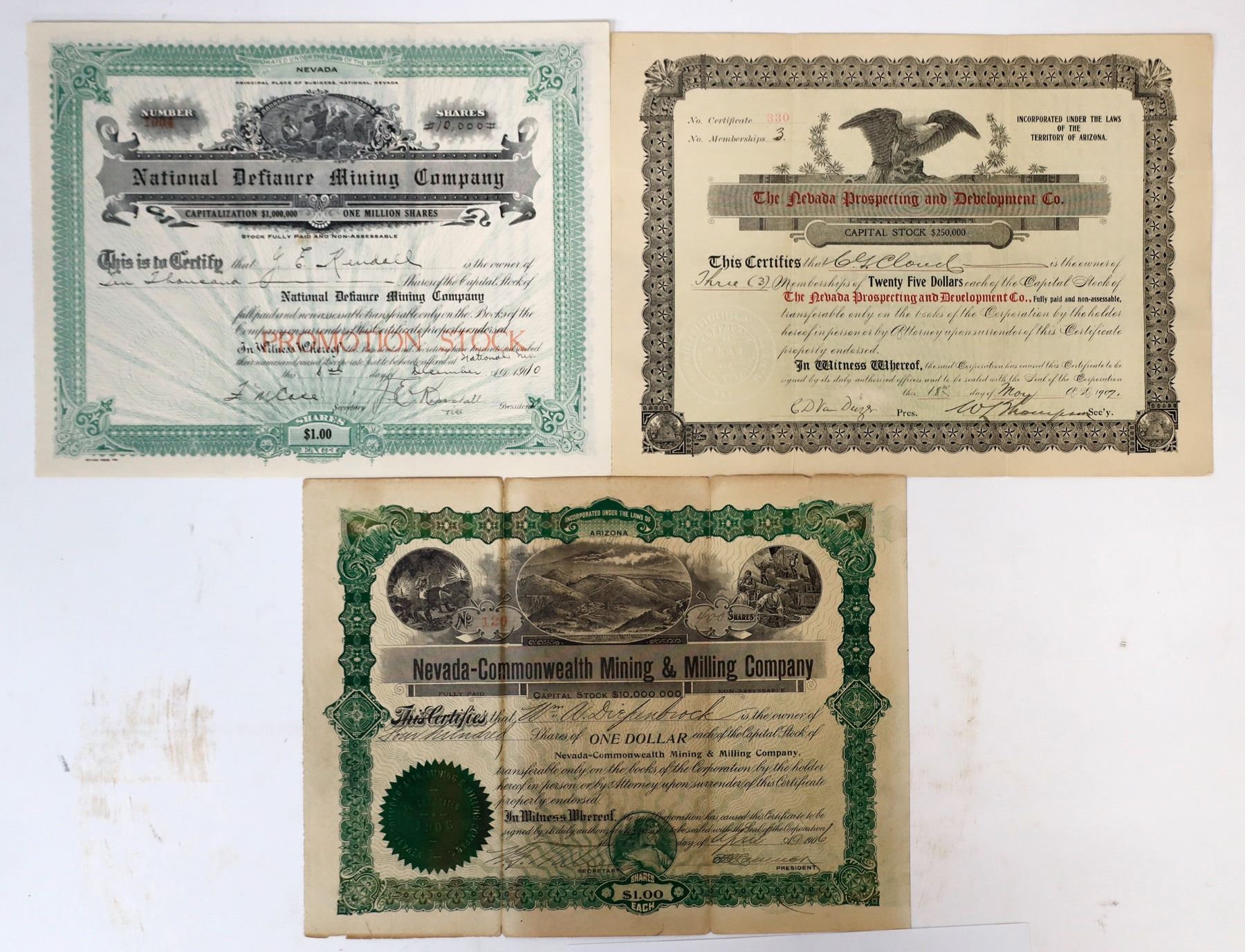1) National Defiance. 1907. # 330, Membership #3. Signed by secretary van Duzer. He was a member of the United States House of Representatives at this time. He used his position of power to push this stick. Stock was sold for a mine that did not exist. 2) Nevada Commonwealth M&M. 1906. Willow Creek in Washoe County. The company seemed to constantly push the truth: like their property was worth $7,000,000 (or $200,000,000 today). Two months after the company was incorporated it was being investigated for fraud. #120 for 400 shares to William A Dieffenbach on April 18, 1906. Signed by W. F. Miller secretary and (?) president. 3) National Defiance. 1910. # 1004 for 10,000 shares of "Promotion Stock". Issued to J.E. Kendall and signed by Kendall as vice-president. Printed by Nevada Press. Kendall leased the first Goldfield mining property and his strike created the rush to Goldfield. The National Defiance Mine had the interest of local newspapers throughout 1910. No wonder someone would want to invest in the rather worthless mine. After all, sometimes hype is better than production. (Includes notes on the companies and people.)