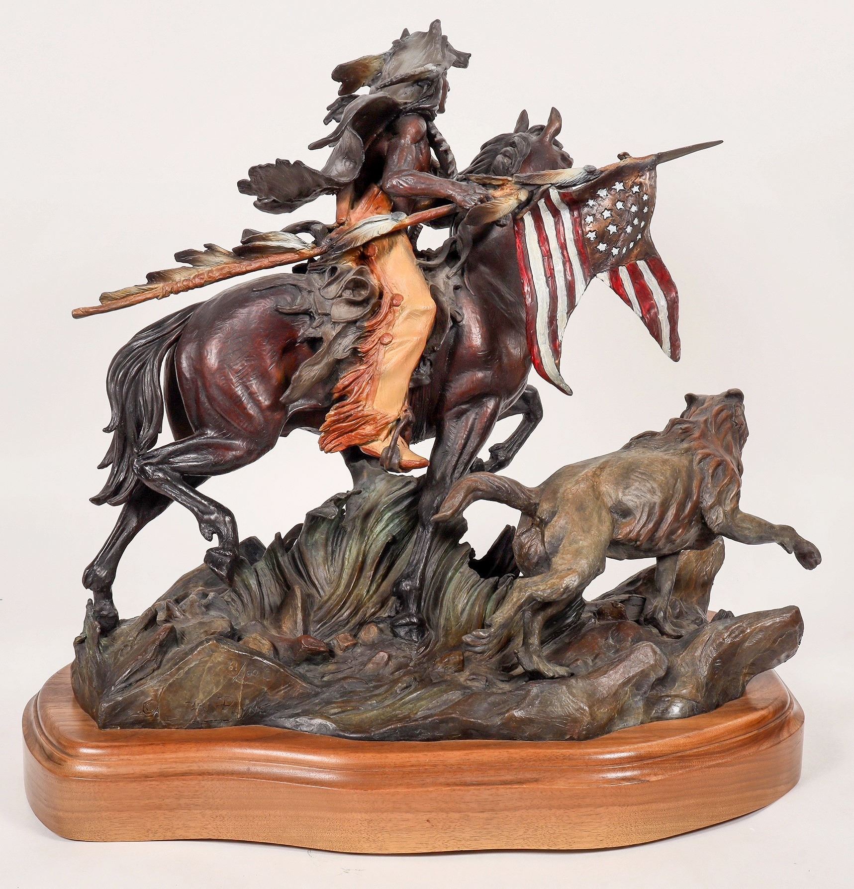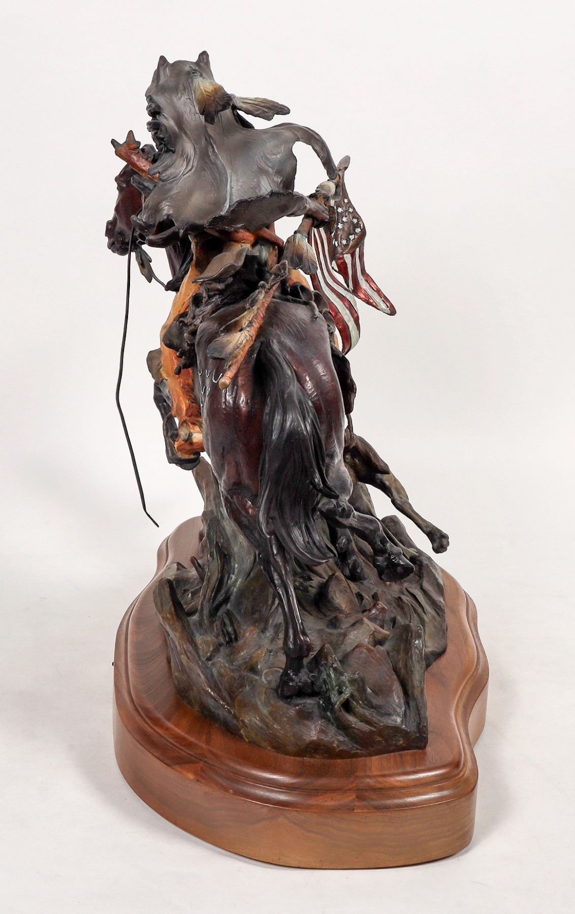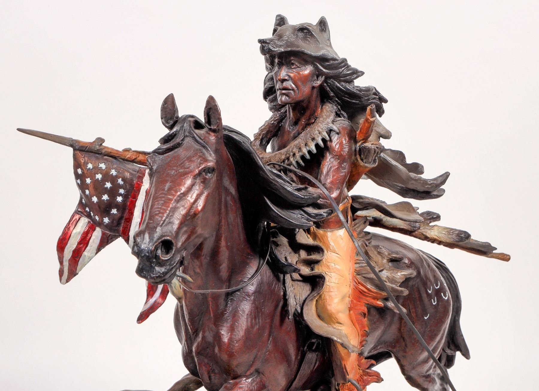 Spectacular hand color enhanced detailed bronze of a Sioux warrior carrying away the flag of the 7th cavalry after defeat of Custer at the Little Big Horn.