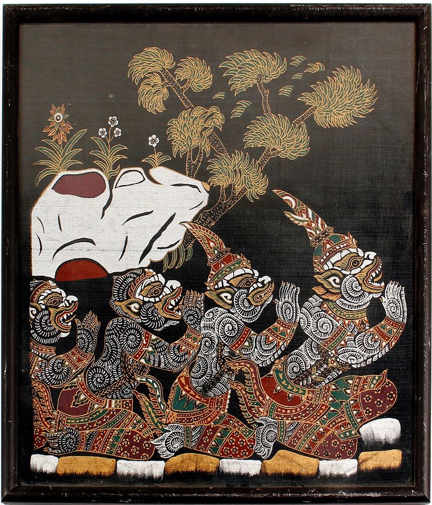 Framed piece of fabric with images of deities and rabbit in background. 19" x 17", framed in simple wood frame. Date: Location: zTibet HWAC# 56809