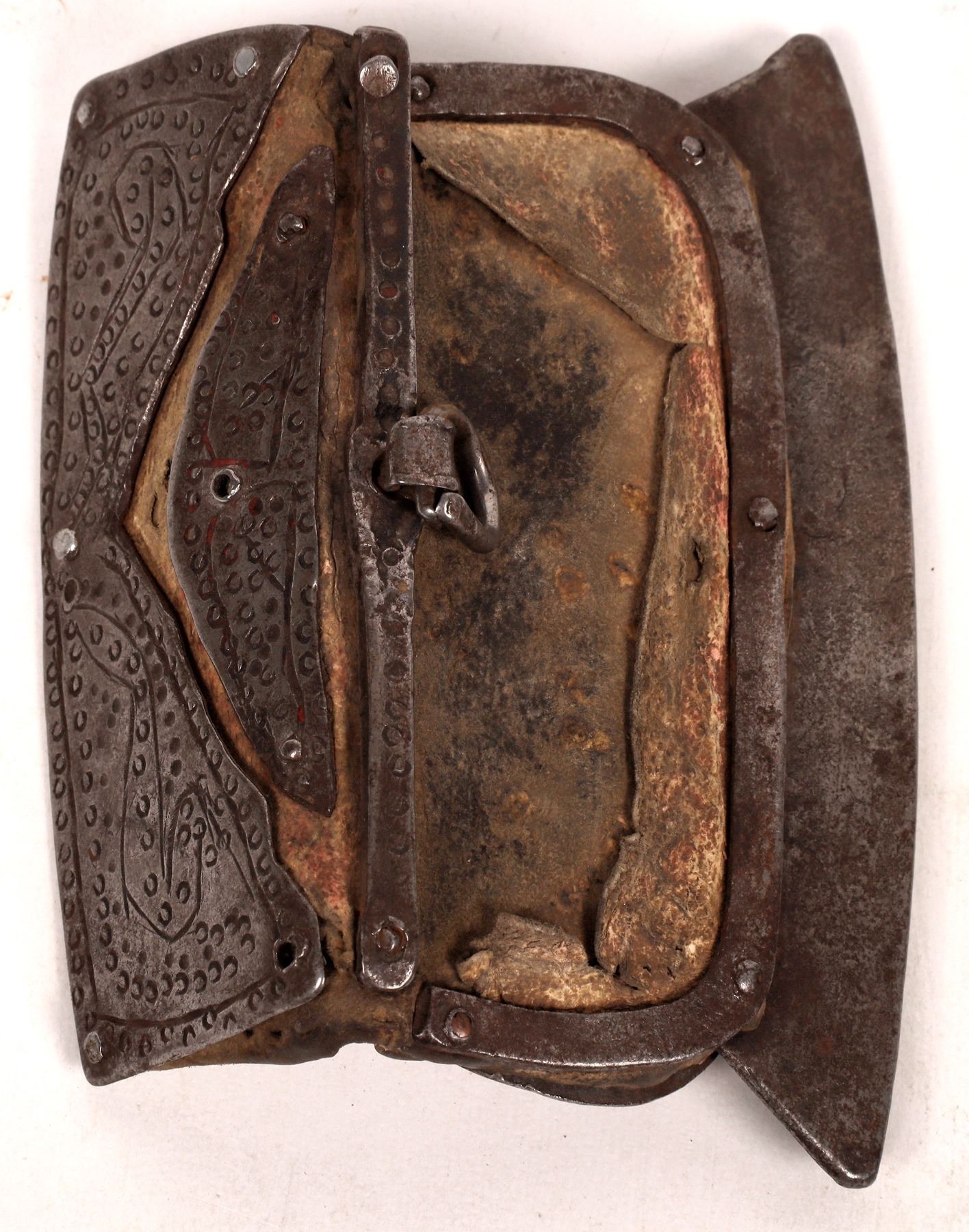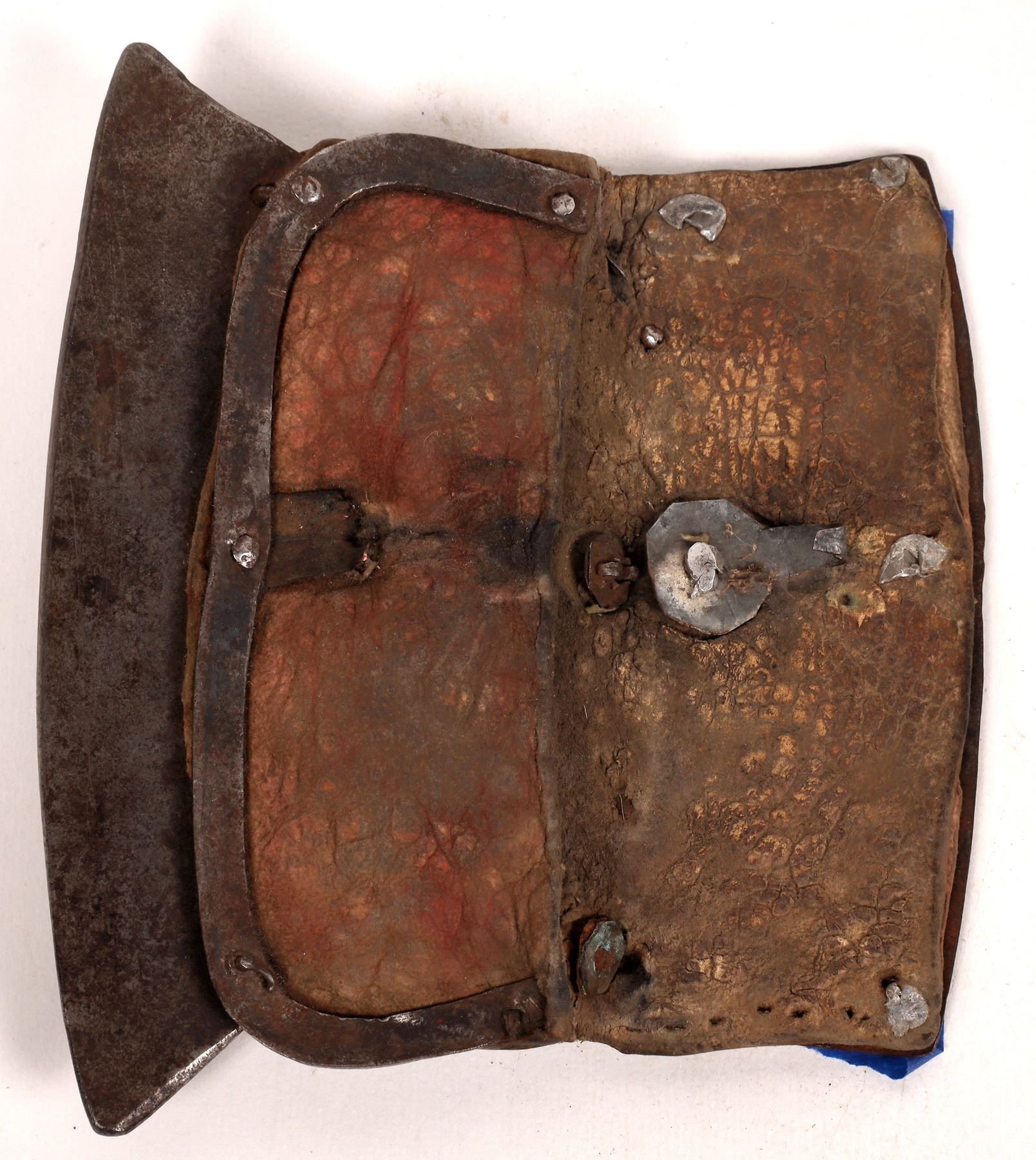 Early antique Tibetan Flint pouch, called a "Chuckmuck", an onomatopoeic word that resembles the sound made by the steel striker when it is stricken on the flint stone. Chuckmucks were used by travelers in the remote Himalayas and Tibetan plateau, where the ability to produce fire was a necessity of survival. This flat silver and leather pouch still holds a fragment of chert (selce) or firestone/flint-stone and a small amount of very old tinder, consisting of woody slivers and wool or kapok. It has the common thick, curved, steel striker along the bottom. Chuckmucks were worn suspended from leather belts or mechags and were made of leather, brass, silver and a variety of stones and beads for decoration. This example is an earlier hand-tooled piece with a simple pattern etched into the alloy. Flint pouches gradually slipped into obscurity when matches became commonplace; by the end of the 19th century they were rarely still used. Measures approx. 7" x 4.5".