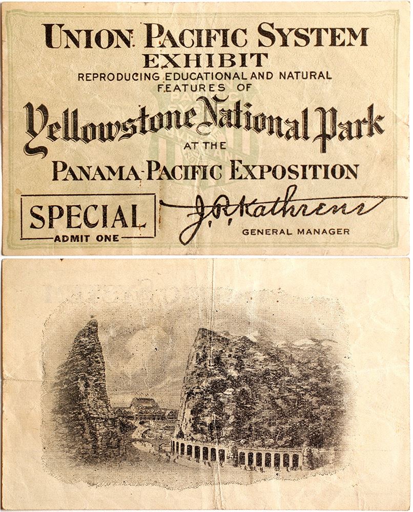 Rare! Special Admit One ticket for Yellowstone National Park Exhibit by the Union Pacific System, "Reproducing Educational and Natural Features." Signed by General Manager J.R. Kathrens. Reverse has an illustration of the exhibit, which looks pretty amazing! Folds and creases. 2.5 x 4" From the Desert Evening News: "At the Panama-Pacific international exhibition at San Francisco, undoubtedly the most elaborate concession is the great Yellowstone park exhibit of the Union Pacific system, involving a reproduction of Old Faithful Inn, a birdseye profile miniature of Yellowstone park, Old Faithful geyser in action, vista of various Yellowstone park scenes reproduced in all their beauty of coloring, exactly as they meet the eye in the park. Some idea may be obtained of the scope of this wonderful spectacle when it is known that the sum of $400,000 has been spent in reproducing upon an elaborate scale the glories of the great national playground. Neither money nor effect was spared to make the reproduction worthy of the original down to the most minute detail. With this spirit dominating the work it was decided that the great scenic effects of rocky crags and cliffs should not be mere haphazard combinations of wood framework and plaster and paint. Instead, forms were made over real rocks, which were first dipped in plaster of paris and spread over the rocks, being fitted to every crack and crevice. This was allowed to dry and at the proper time an extra half-inch of plaster was applied to the surface..." (Potter Collection) HWAC# 60402 Date: 1915 Location: San Francisco, California