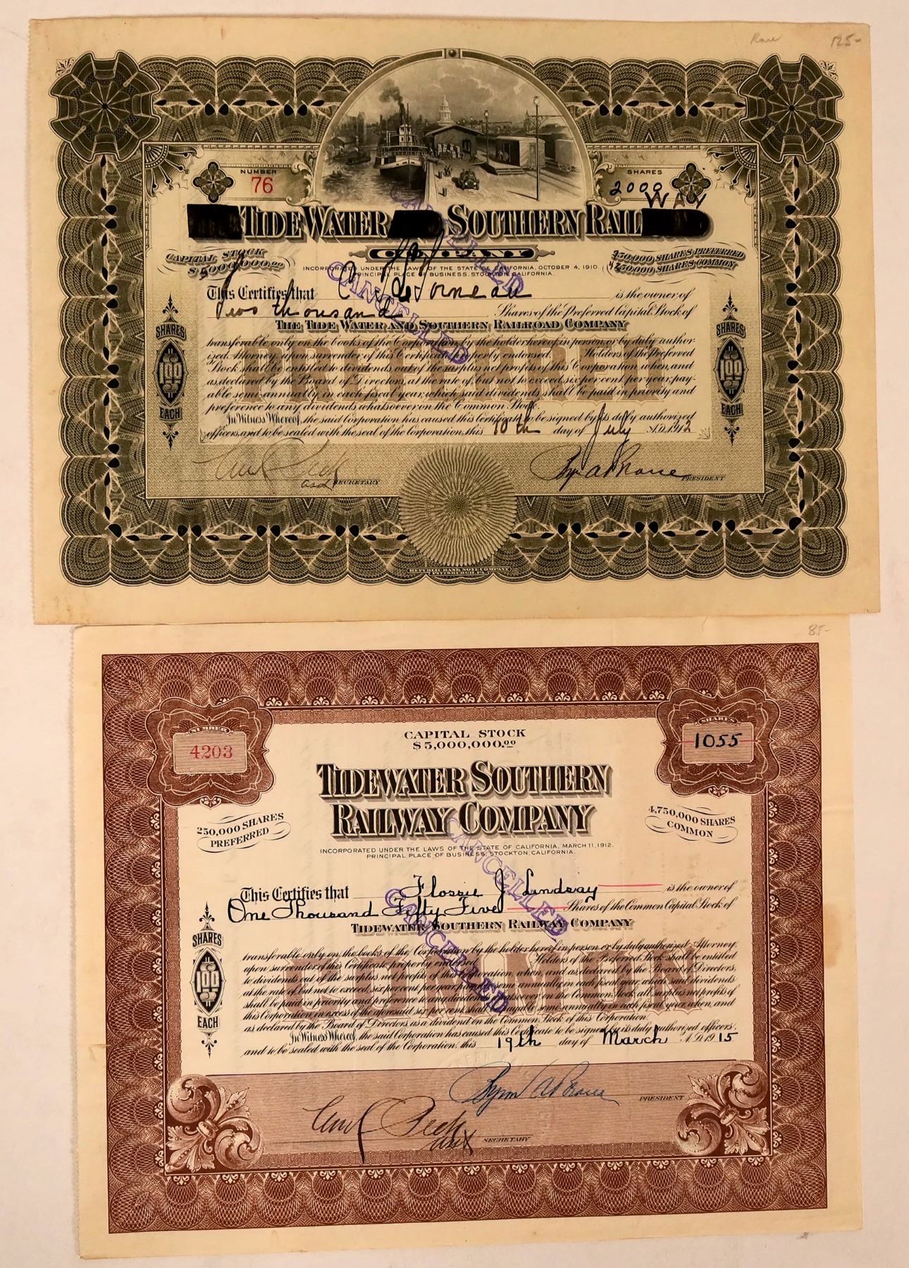 2 certificates.incorporated in 1910 it was a subsidiary of the Western Pacific Railroad. It was originally built as an interurban system, connecting to the Central California Traction Company, Western Pacific Railroad, Southern Pacific Railroad and Atchison, Topeka and Santa Fe Railway in Stockton, California. Today, much of the line is still operated by the Union Pacific Railroad. 1. #76, I/C, 2000 shares @ $100 ea. Issued July 10, 1912. Olive, embossed seal, vignette top rail depot next to dock, PREFERRED olive underprint, Certificate was originally The Tidewater Southern Railroad Co. "THE" is crossed out and "ROAD" crossed out WAY written in. Republic Bank Note Co printer. VF 2. #4203, I/C, 1055 shares @ $100 ea. issued March 19, 1915 Pres/Sec signed, Brown, embossed seal, no vignette, COMMON brown underprint, 11 revenue stamps on reverse. Schmidt Litho printer. EF