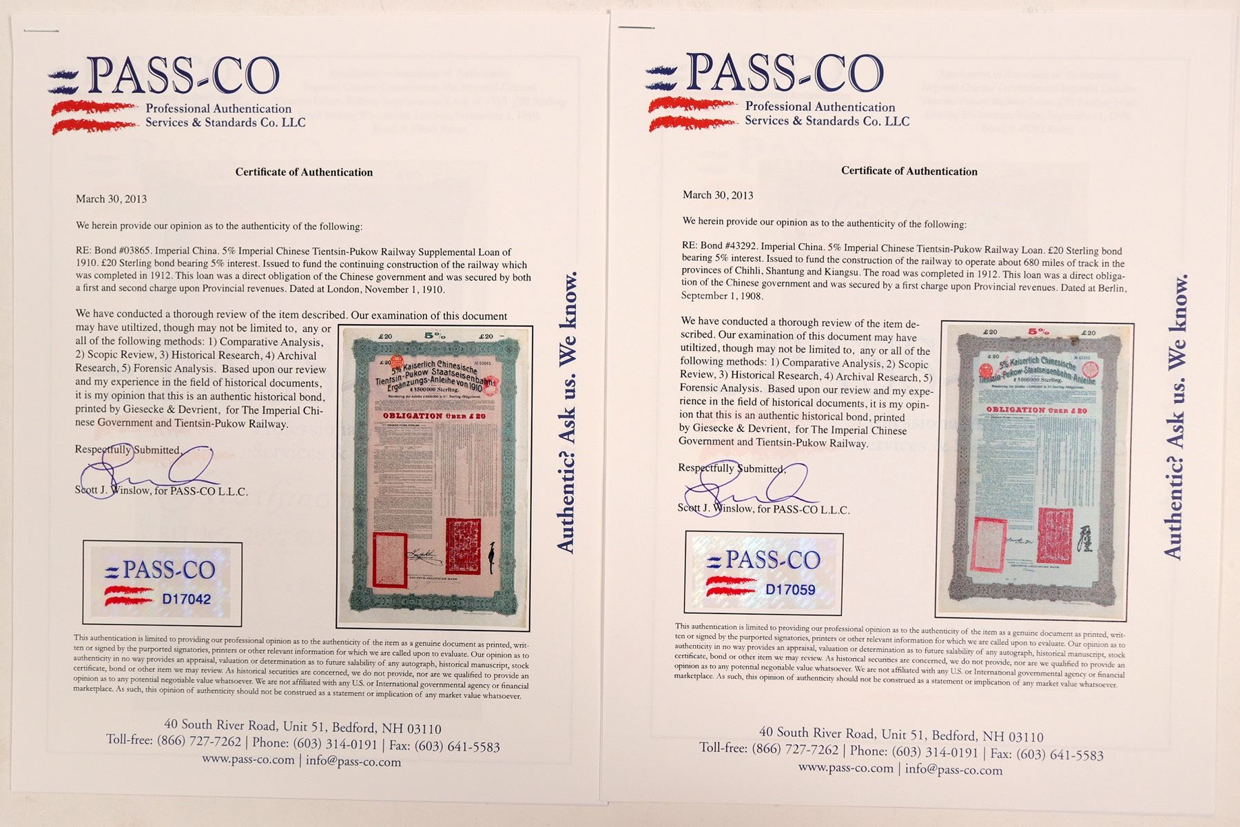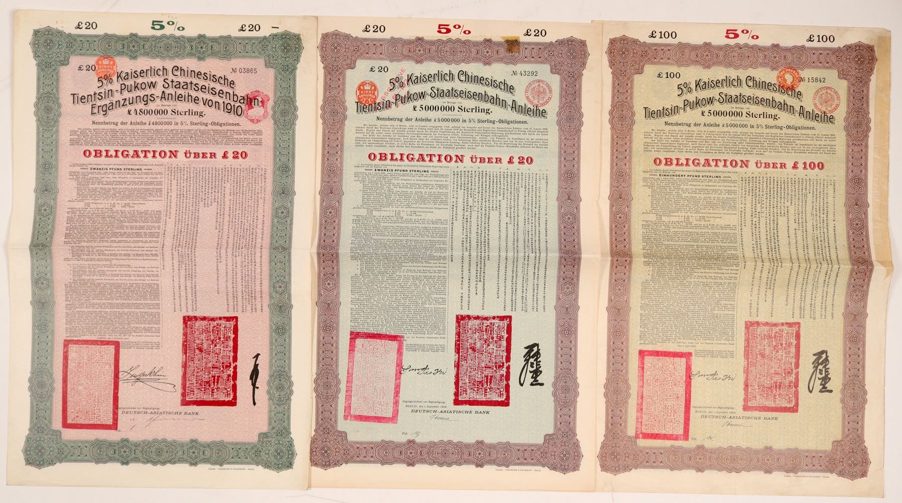Three bonds related to this railroad. The first two are $20 and $100 pound sterling bonds; the third is a supplemental bond, $20, 1912
