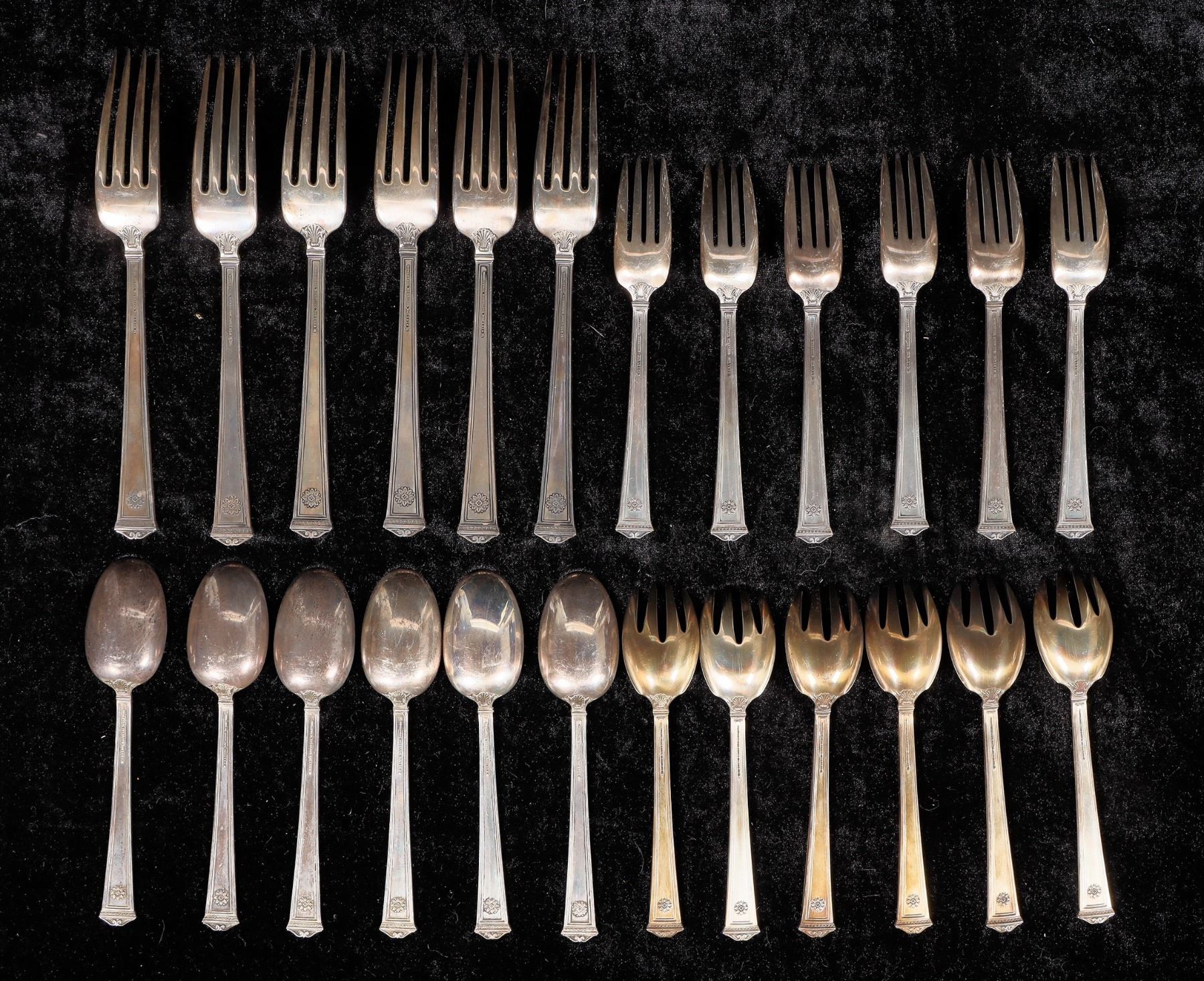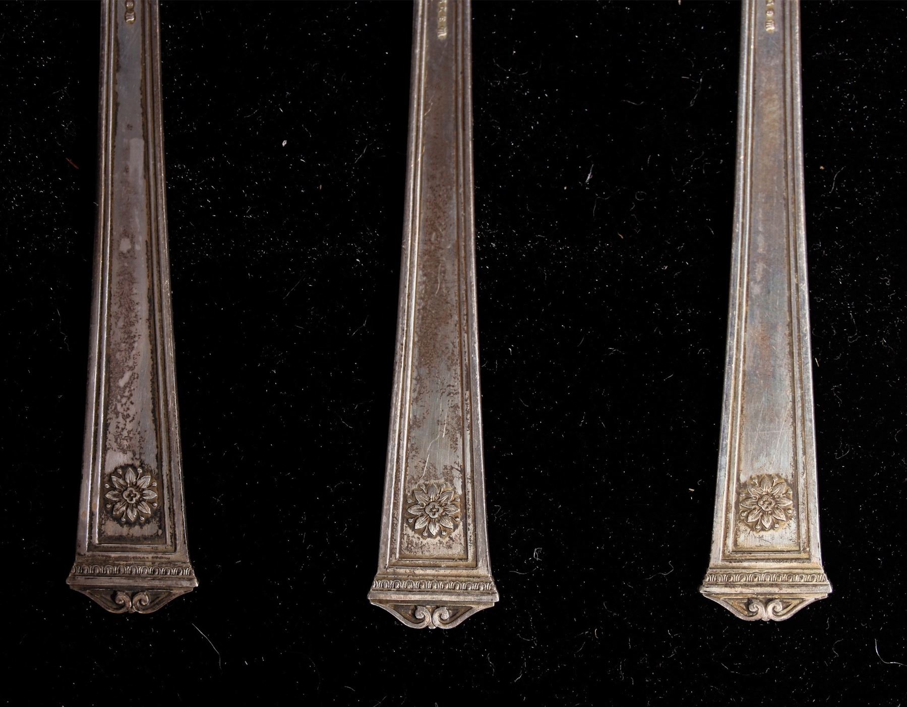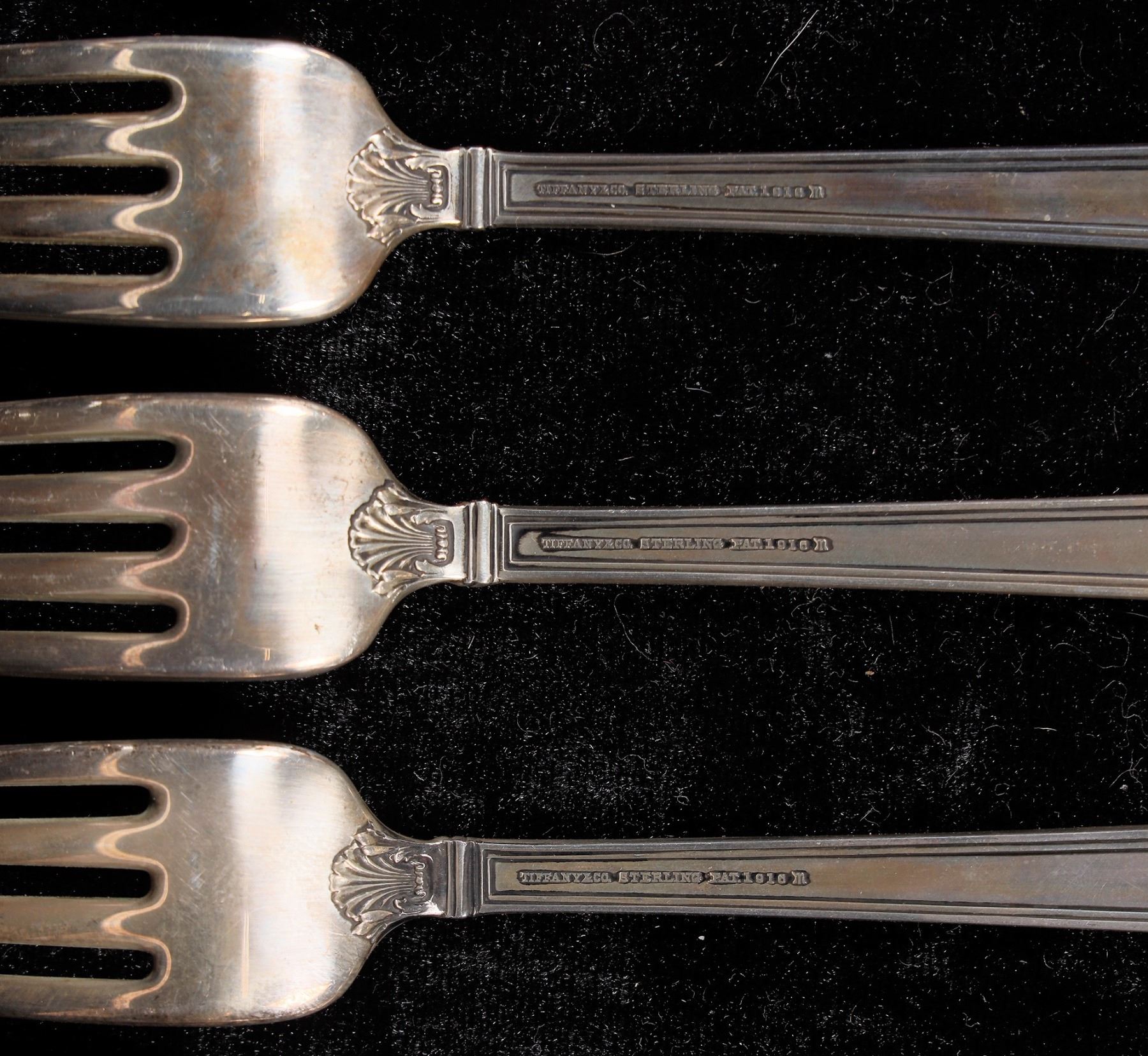 Tiffany Sterling silver flatware. 6 each-pastry forks, teaspoons, large forks, smaller forks, no knives. 1100 grams gross, 33 Troy oz silver content. $950 melt.