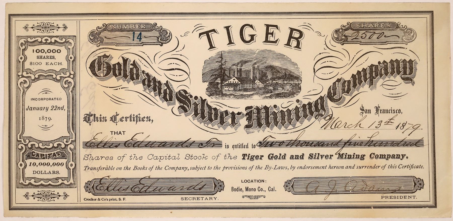 Sought after Bodie stock certificate. Location: Bodie, Mono Co., Cal. (printed at bottom center). Incorporated January 22, 1879. EARLY NUMBER 14, issued for 500 shares to company secretary Ellis Edwards on March 13th, 1879. Signed by president A. J. Adams and Edwards. Not cancelled. Black border and print. Mine vignette. Crocker & Co., SF. Very minor wear to top edge. 4.75 x 9.5" The main office of the Tiger Gold and Silver Mining Company, secretary Ellis Edwards, is listed in the 1879 San Francisco directory at 330 Pine, with the mines located in Mono County.