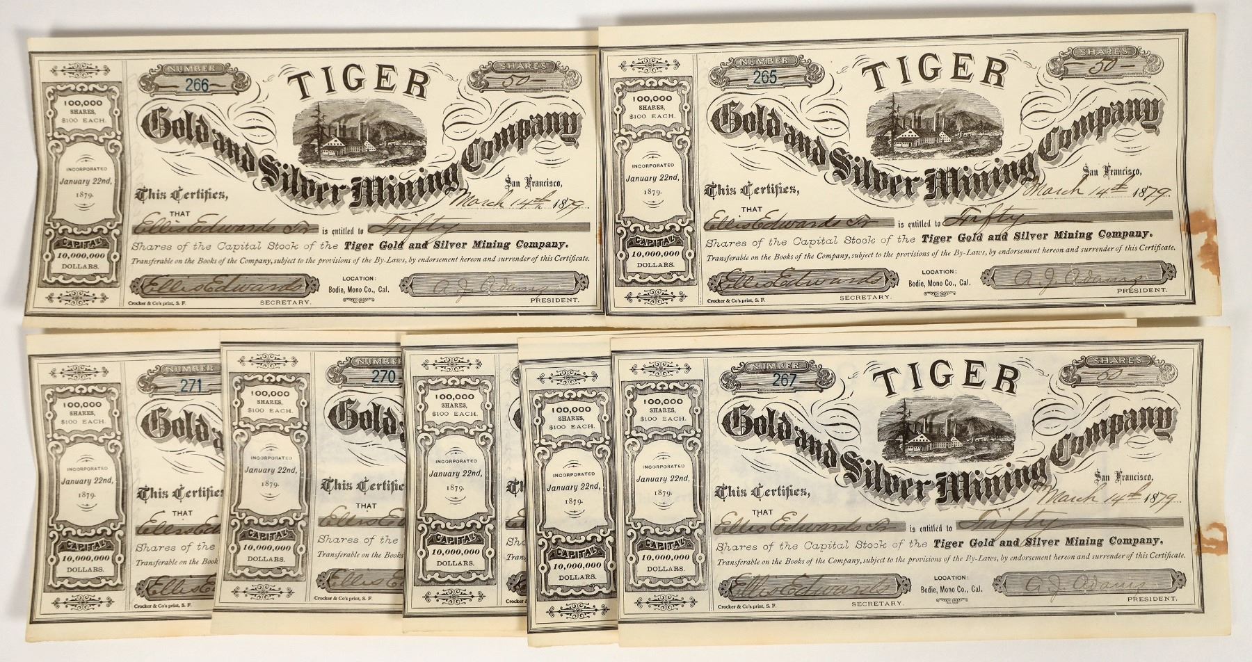 Lot of 7 issued Tiger G& S MC stocks. All issued in 1879 to Ellis Edwards, prominent SF attorney and mine investor (and secretary of this company). Also signed by AJ Adams as president. Black border and print with mining vignettes. Crocker & Co. A rare Bodie stock! According to The Morning Times, Dec. 9, 1879, the tiger had a shaft in 162ft and were expecting to hit the hanging wall in 15 feet. "The mine is looking well."