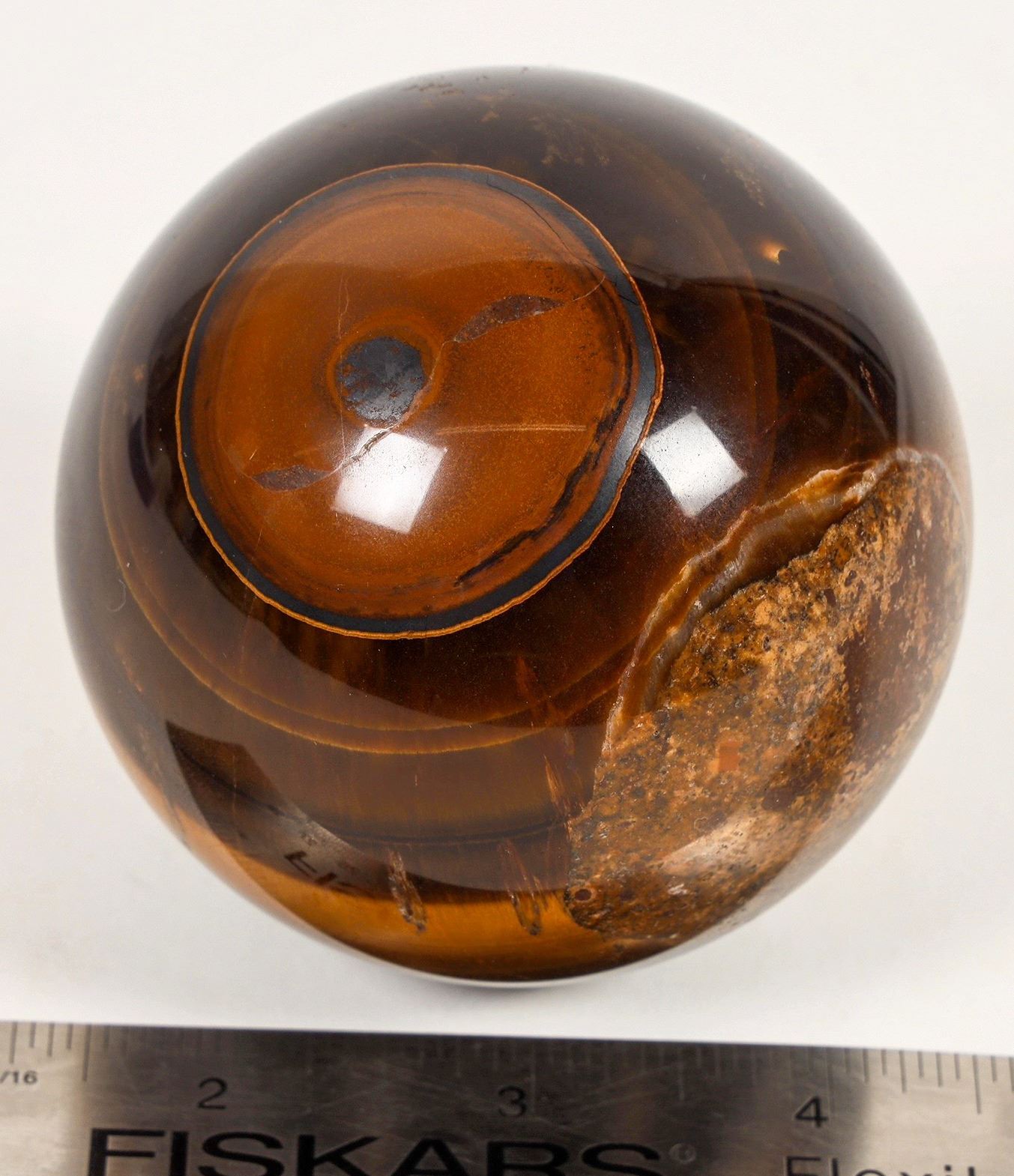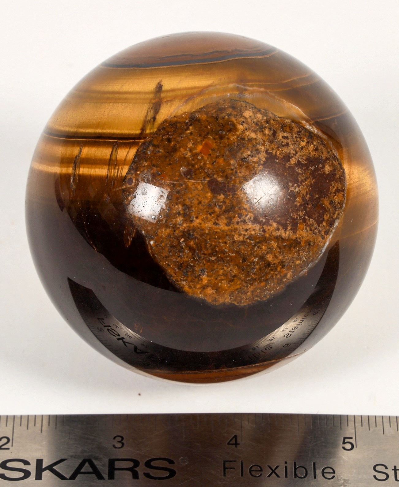 Tiger's eye polished sphere, 3" diameter. Excellent. Gorgeous bands of color shift when turned. See photo.
