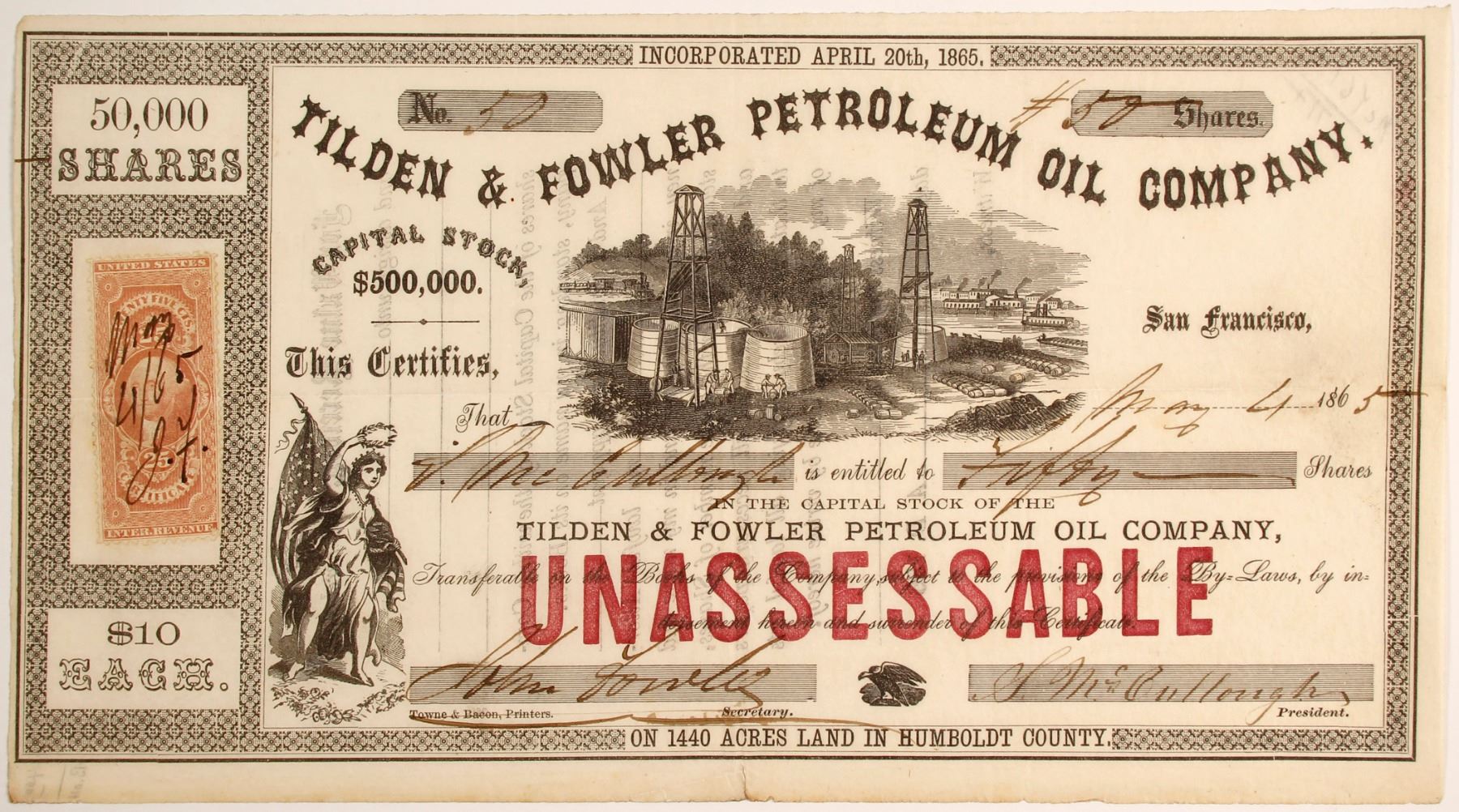 # 50 for 50 shares! How cute! To (?). Datelined San Francisco 1865. Signed by secretary John (?) and president McCullough. Incorporated April 20th, 1865. Uncancelled. Oil field vignette. "On 1440 acres land in Humboldt County." 25c certificate Revenue Stamp. The location of the lands was not mentioned on incorporation and we could not find it 150 years later. Prag collection.