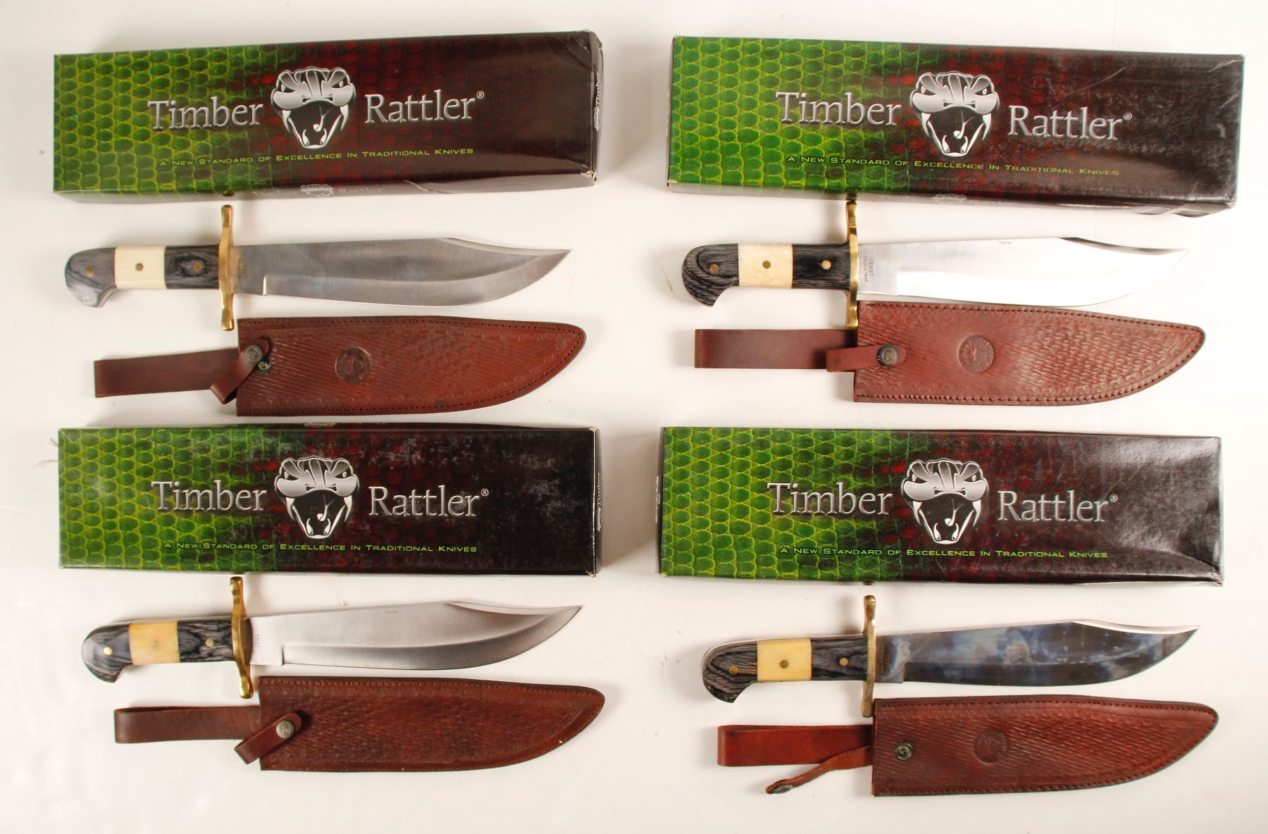 This is a set of four Timber Rattler TR87 Bowie knives 16 1/2 in. OAL/ 11 in. blades. The grips are black Pakkawood and bone. NIB with sheaths. Date: City: State: HWAC# 334466