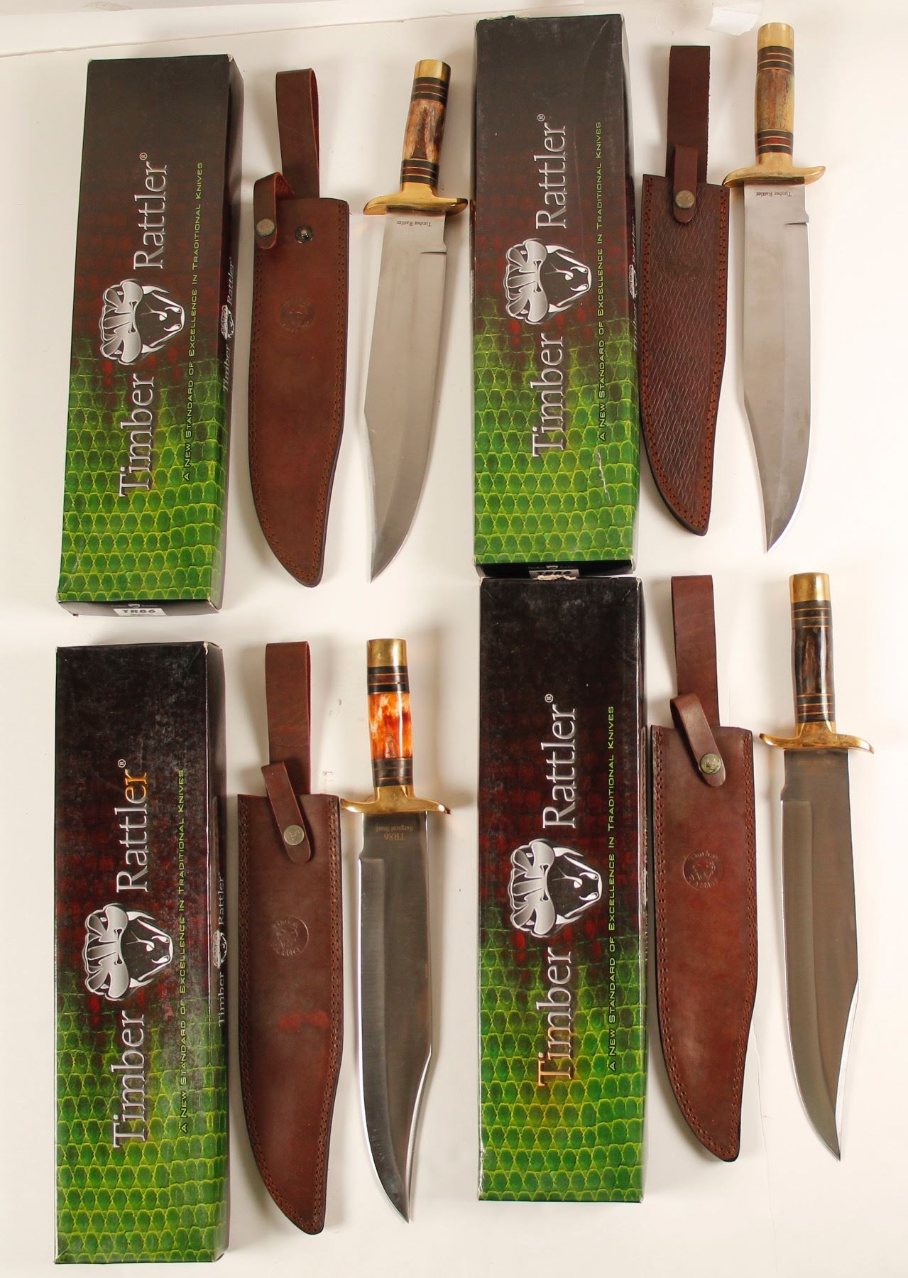 This is a grop of four Timber Rattler Bowie knives model TR86 16 on. OAL/ 11 1/2 in. blade with bone handles no two are exactly alike. NIB with sheaths. Date: City: State: HWAC# 33465