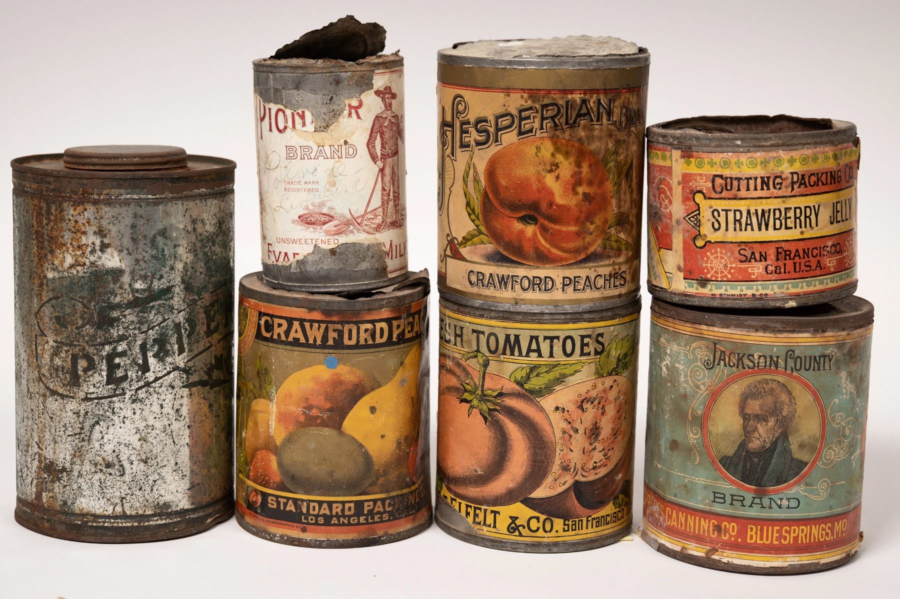 Lot of seven tin cans for general store goods including peaches, strawberry jelly, tomatoes, evaporated milk, and pepper. Mostly pre-1900s. Mostly from locations in California including Hayward, San Francisco, and Los Angeles. These cans are old and rusted, but still have great eye appeal. Various sizes, largest is about 7.25 inches tall.