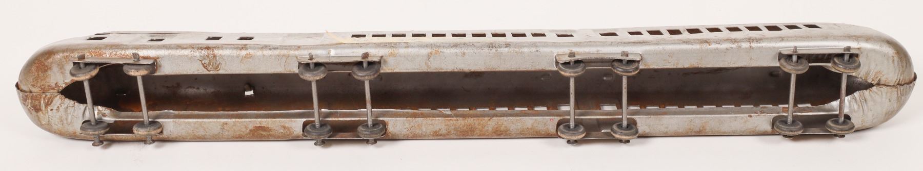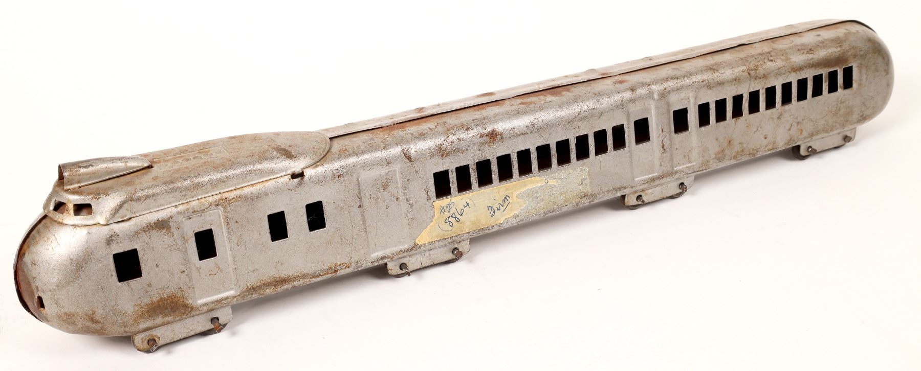 Unknown mfg., may be Marx as that was the major producer of these back in the 20's-40's. This is plain metal, tin, single unit, does not articulate. Other than play wear and age it is good condition, no visible dents and four sets of trucks. Does not appear to have ever been painted in the M1000 colors of yellow/brown. The M-1000 was an early American streamlined passenger train for the Union Pacific that ran from 1934-41. Length is 20" and 3/5 " tall.
