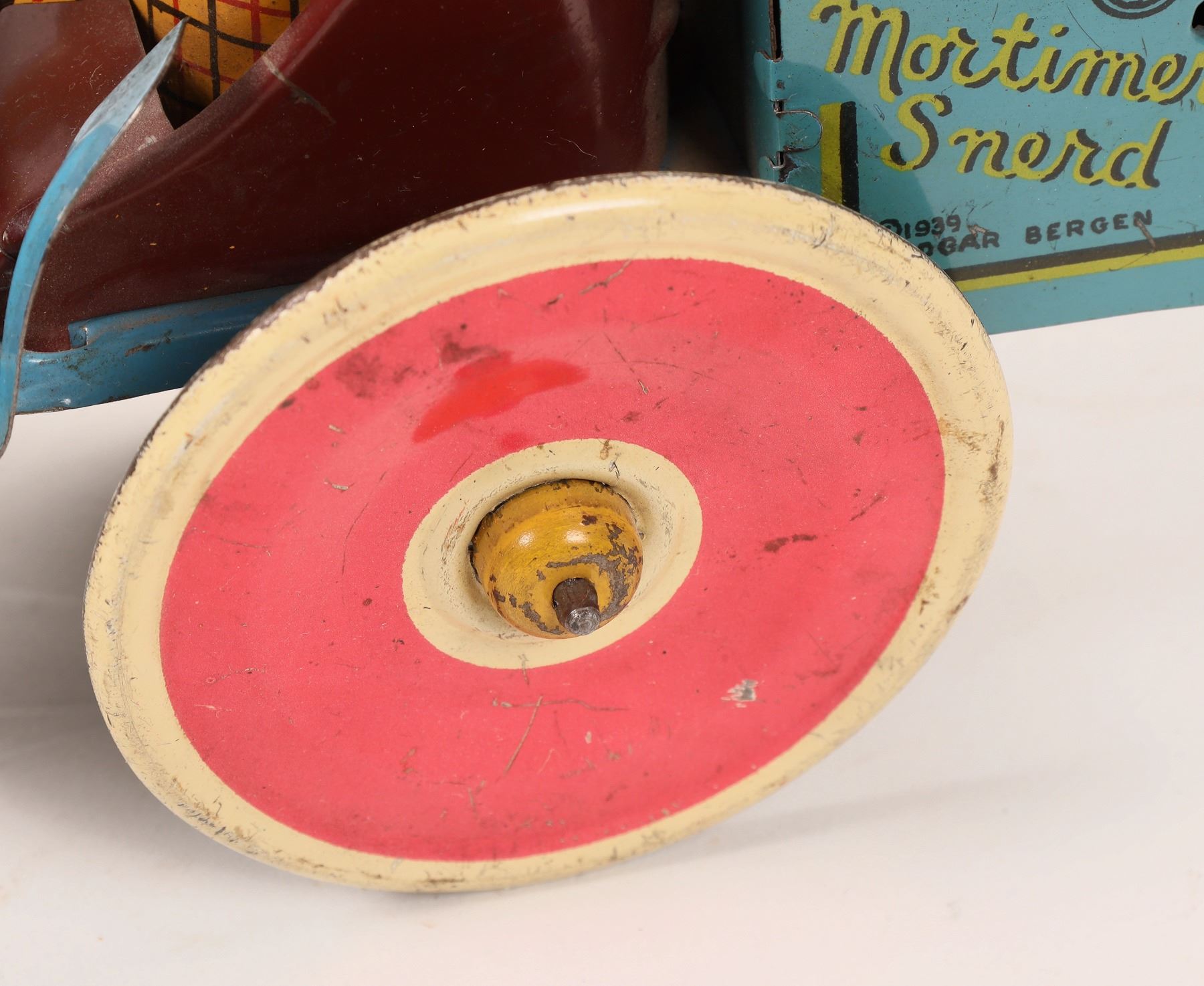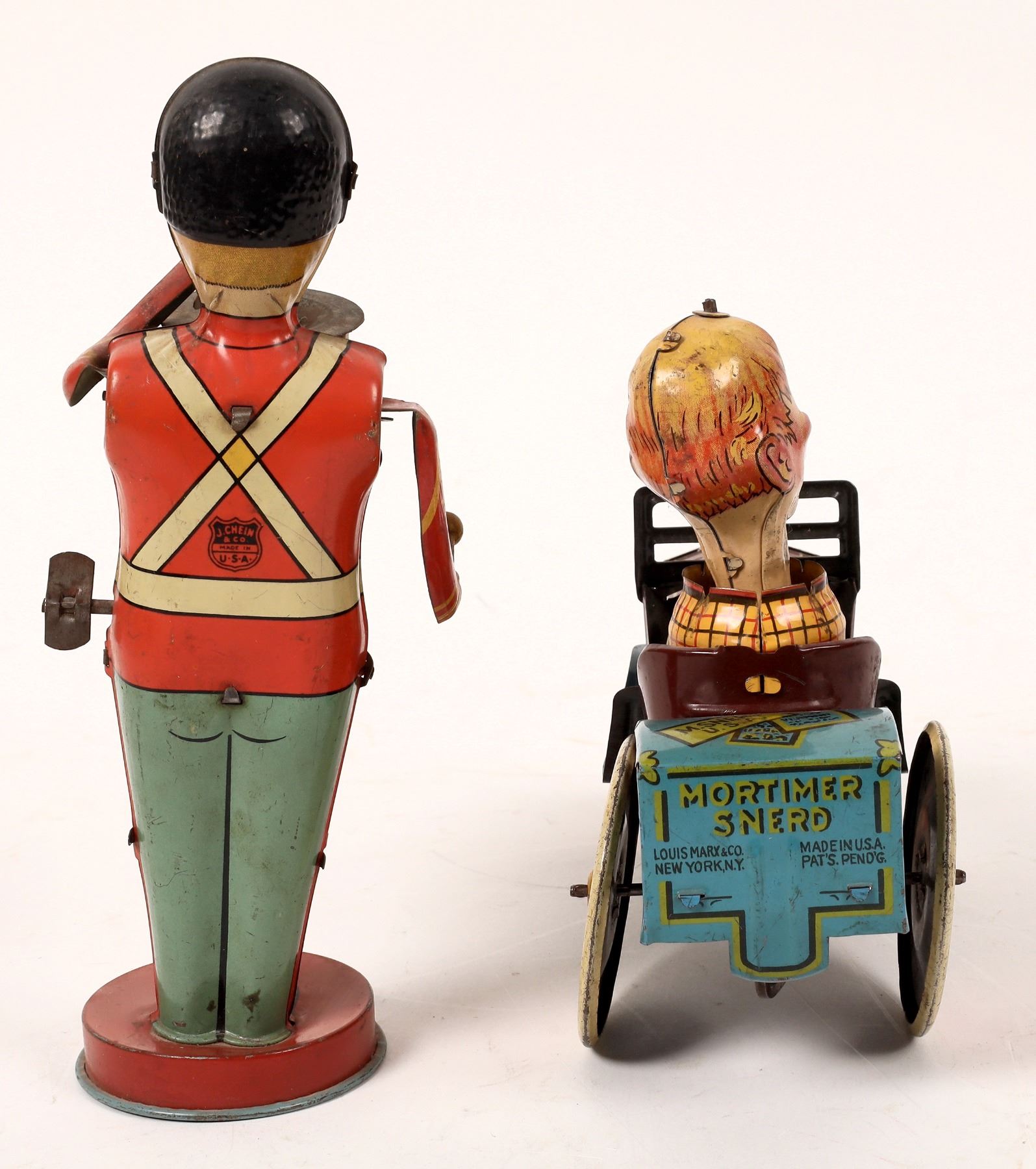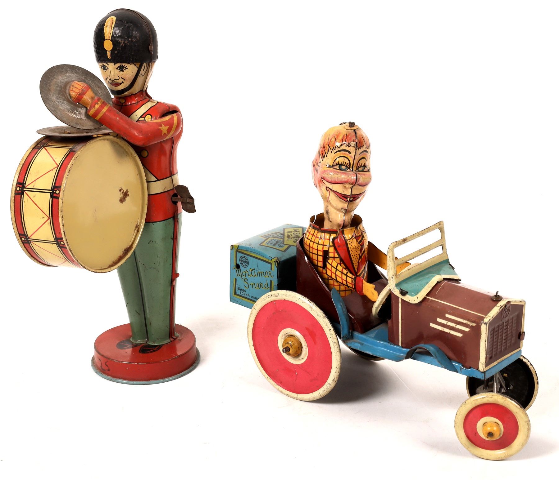 Two tin windup toys from the 1930s. First is a bass drum band member. He measures about 9"x 4". He has wear and the mechanism needs repair. Next, from the Edgar Bergen/Charlie McCarthy Radio Program Mortimer measures 5"x 7". This one also needs its mechanism repaired. Both are very colorful. Please see photos for more details. New York 1939