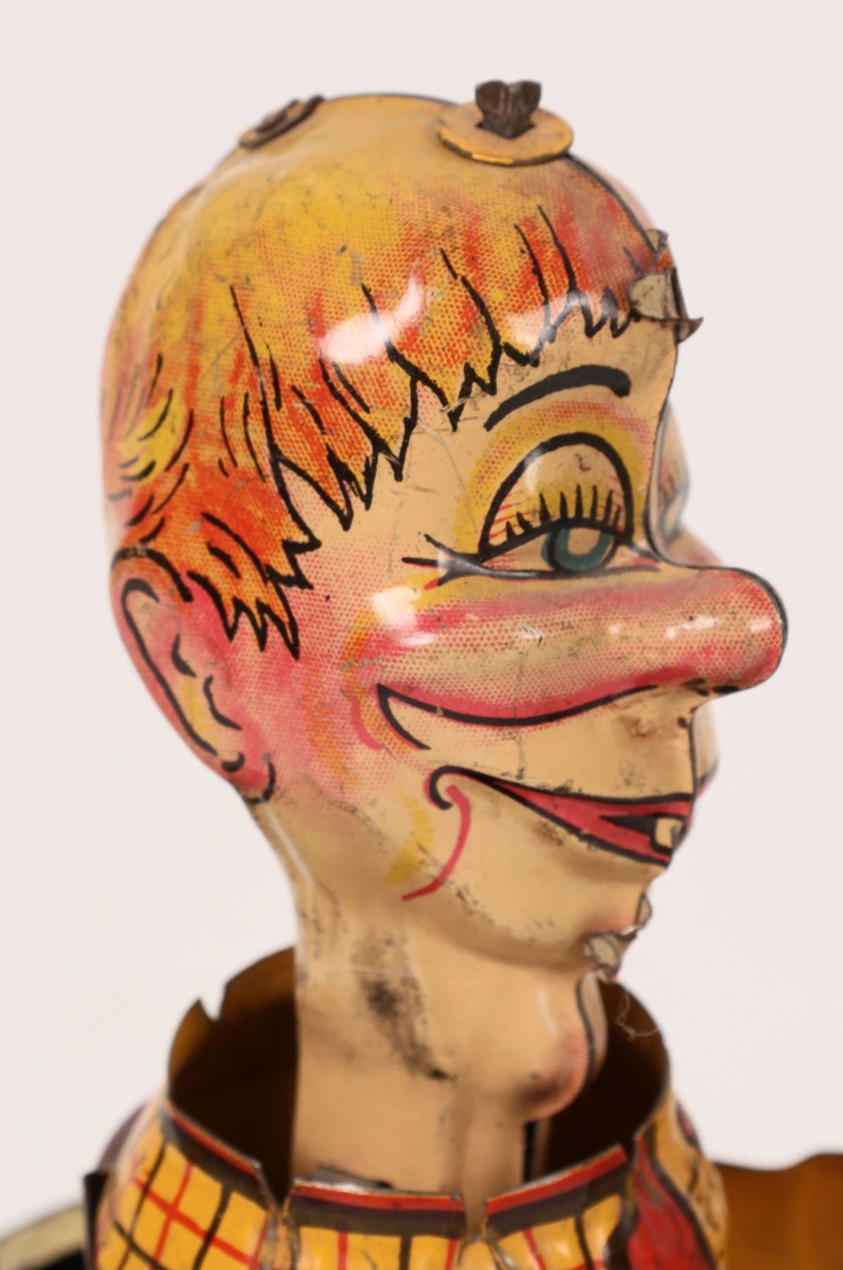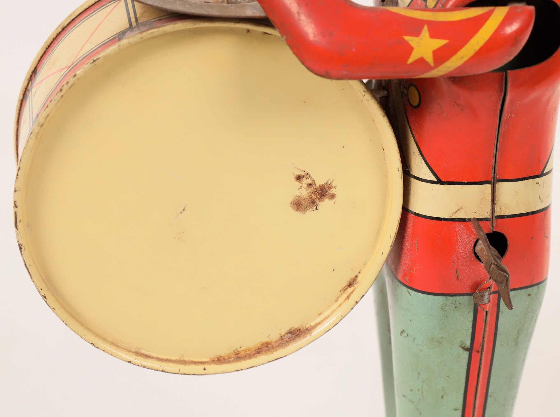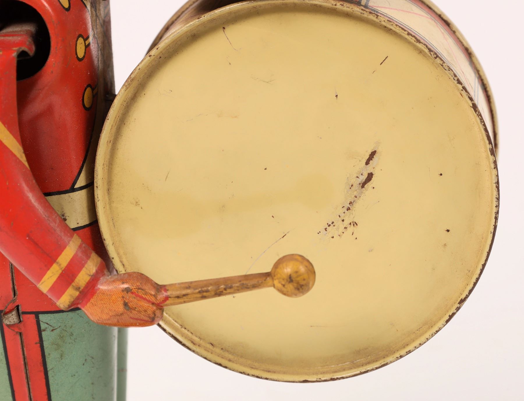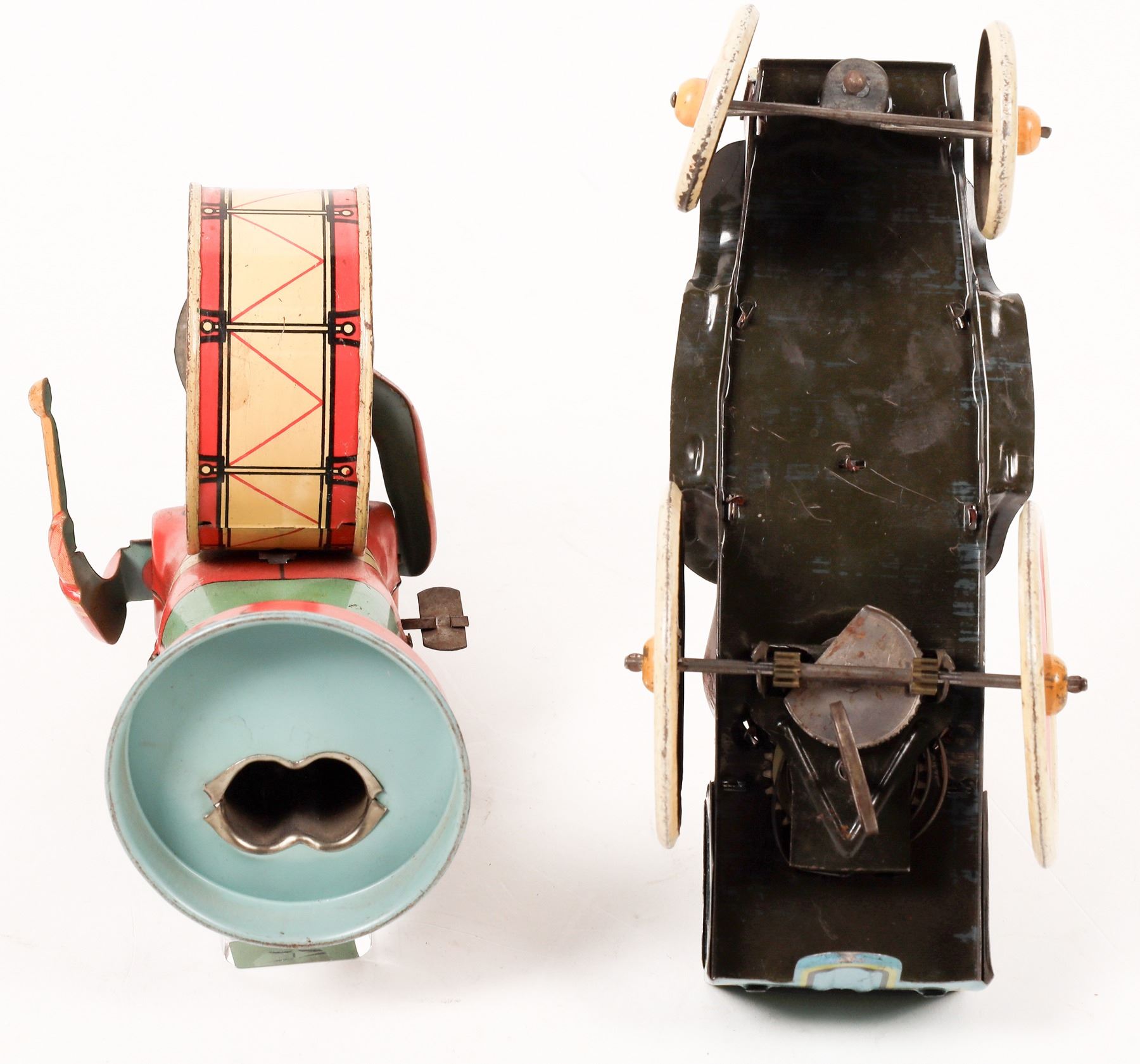 Two tin windup toys from the 1930s. First is a bass drum band member. He measures about 9"x 4". He has wear and the mechanism needs repair. Next, from the Edgar Bergen/Charlie McCarthy Radio Program Mortimer measures 5"x 7". This one also needs its mechanism repaired. Both are very colorful. Please see photos for more details. New York 1939