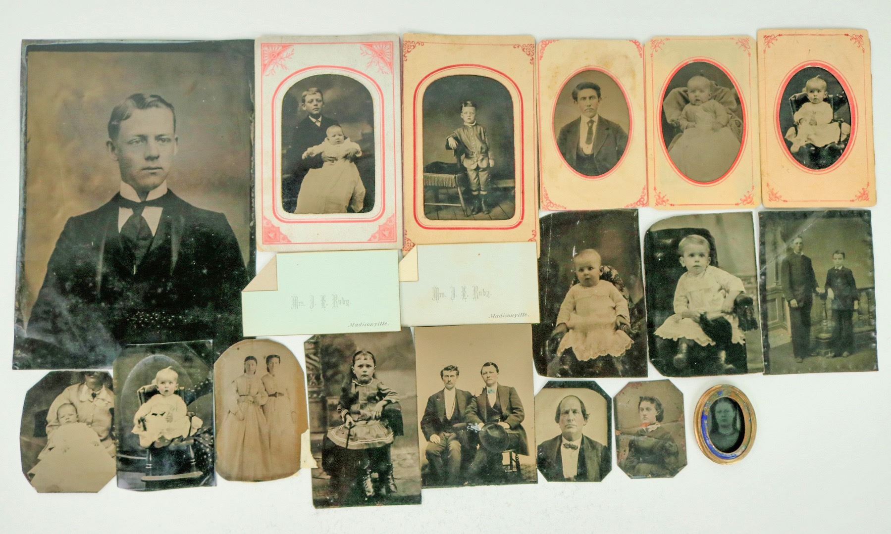 Lot of 17. Largest is 5 x 7". Various individuals from infants to adults. Five are in cardboard frames. There are two personal cards 'Mrs. J.E. Ruby, Madisonville". Doesn't say which state. Seven states have a town named Madisonville.