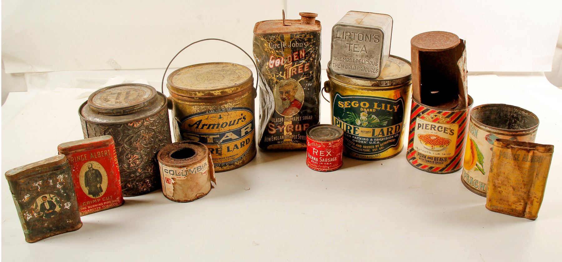 12 old tins dug in Utah-Lipton Tea, peaches, Golden Tree Syrup, lard, sausage and more