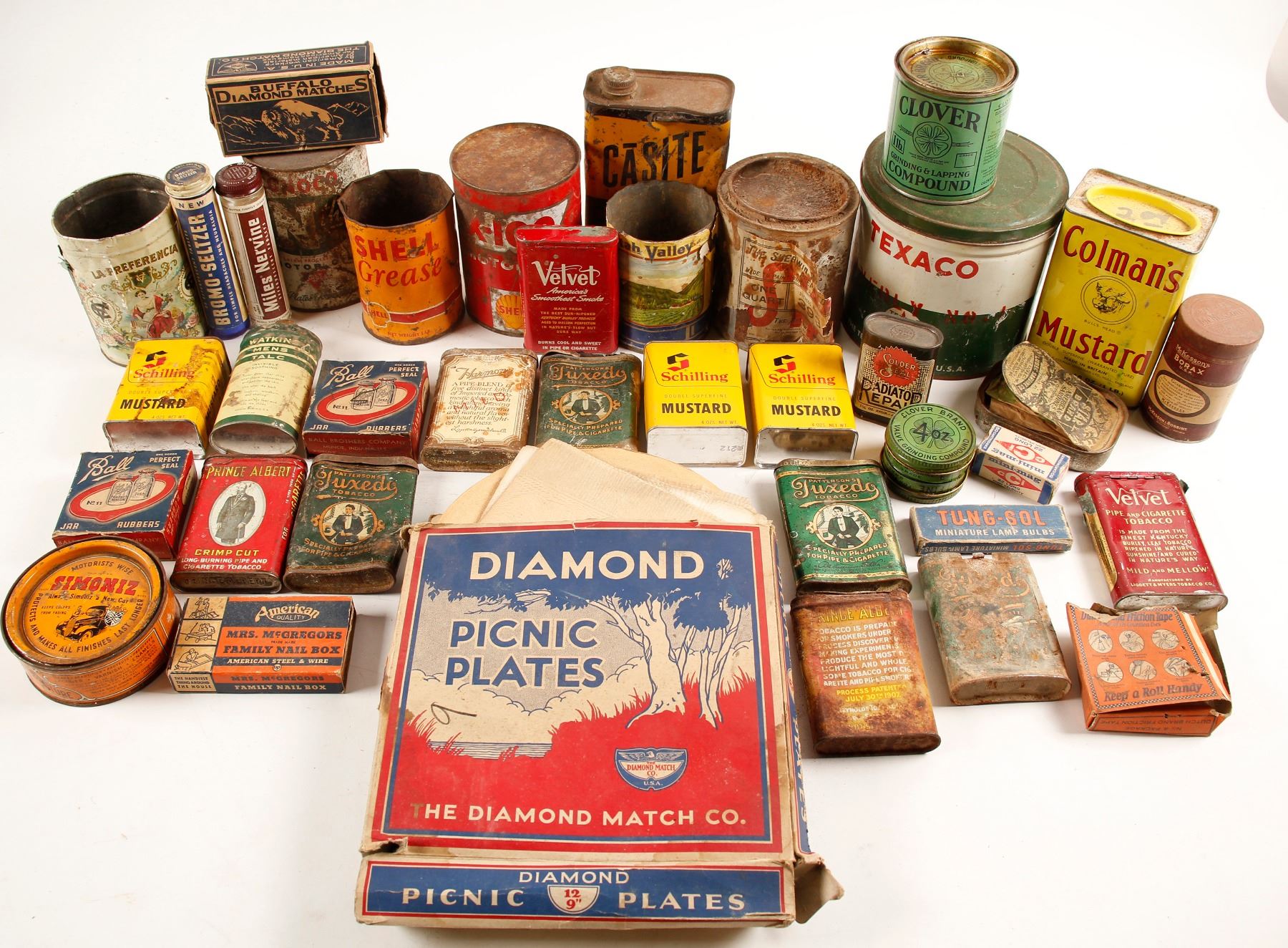 Aprox 25 old tins for oil, tobacco, mustard, Simoniz, match boxes, Diamond picnic plates in original box etc