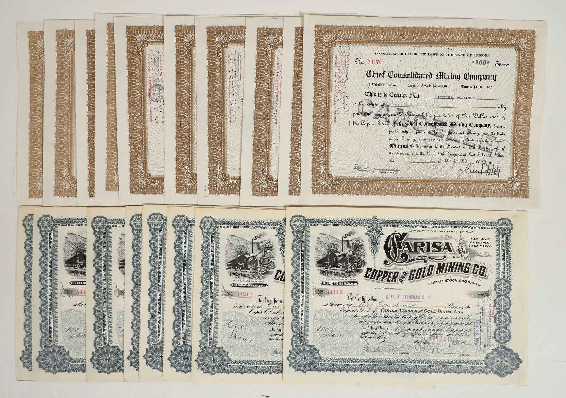 Lot of 19. I/C, I/U. Issued 1911 & 1950. Chief Consolidated Mining Co. and Carisa Copper & Gold Mining Co.. Manhattan BNC printer. Very good condition: no tears, frays or cuts.