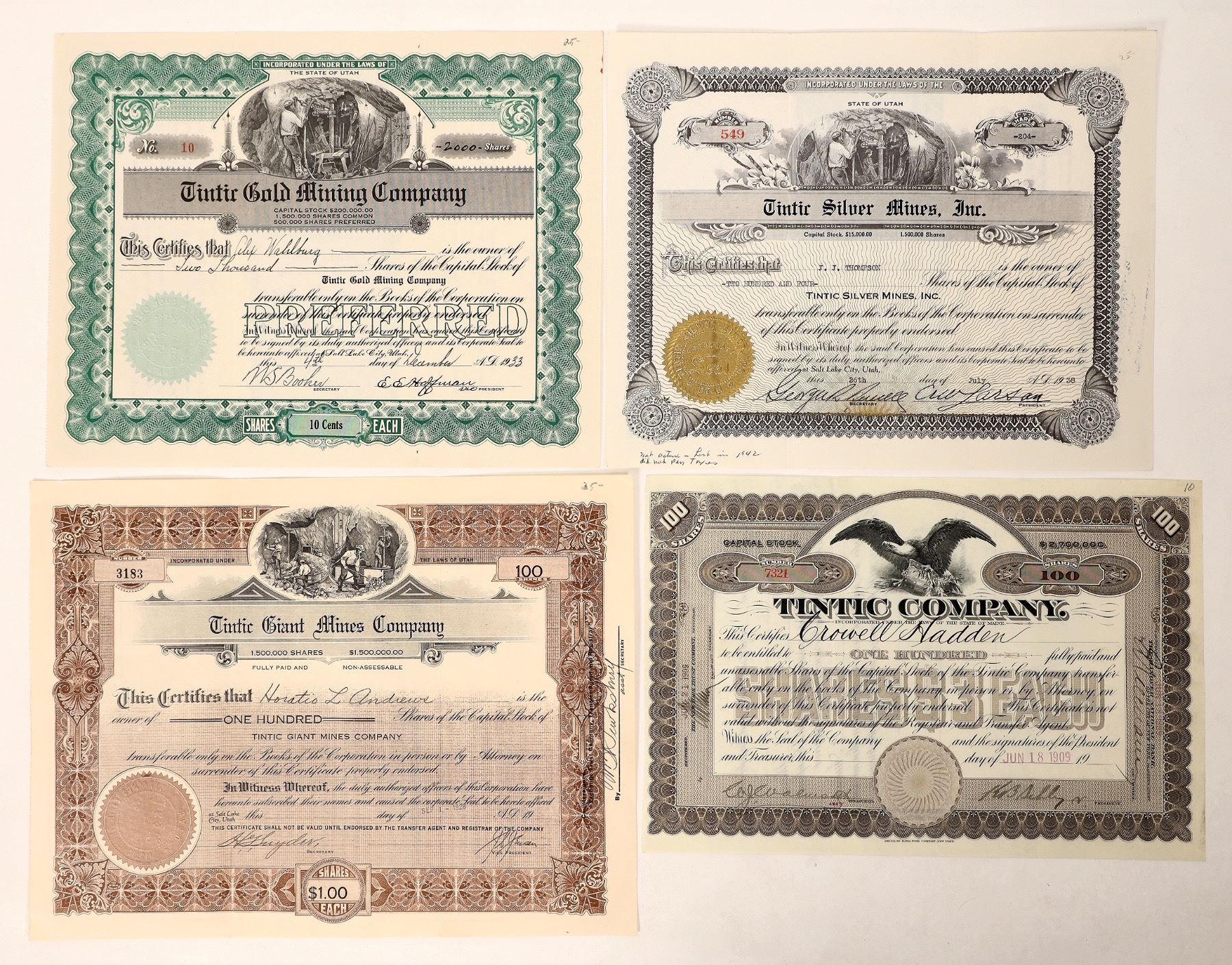 All issued. 1938 Tintic Silver, 1933 Tintic Gold, 1909 Tintic Company, 1928 Tintic Giant Mines.[ Tintic District Utah