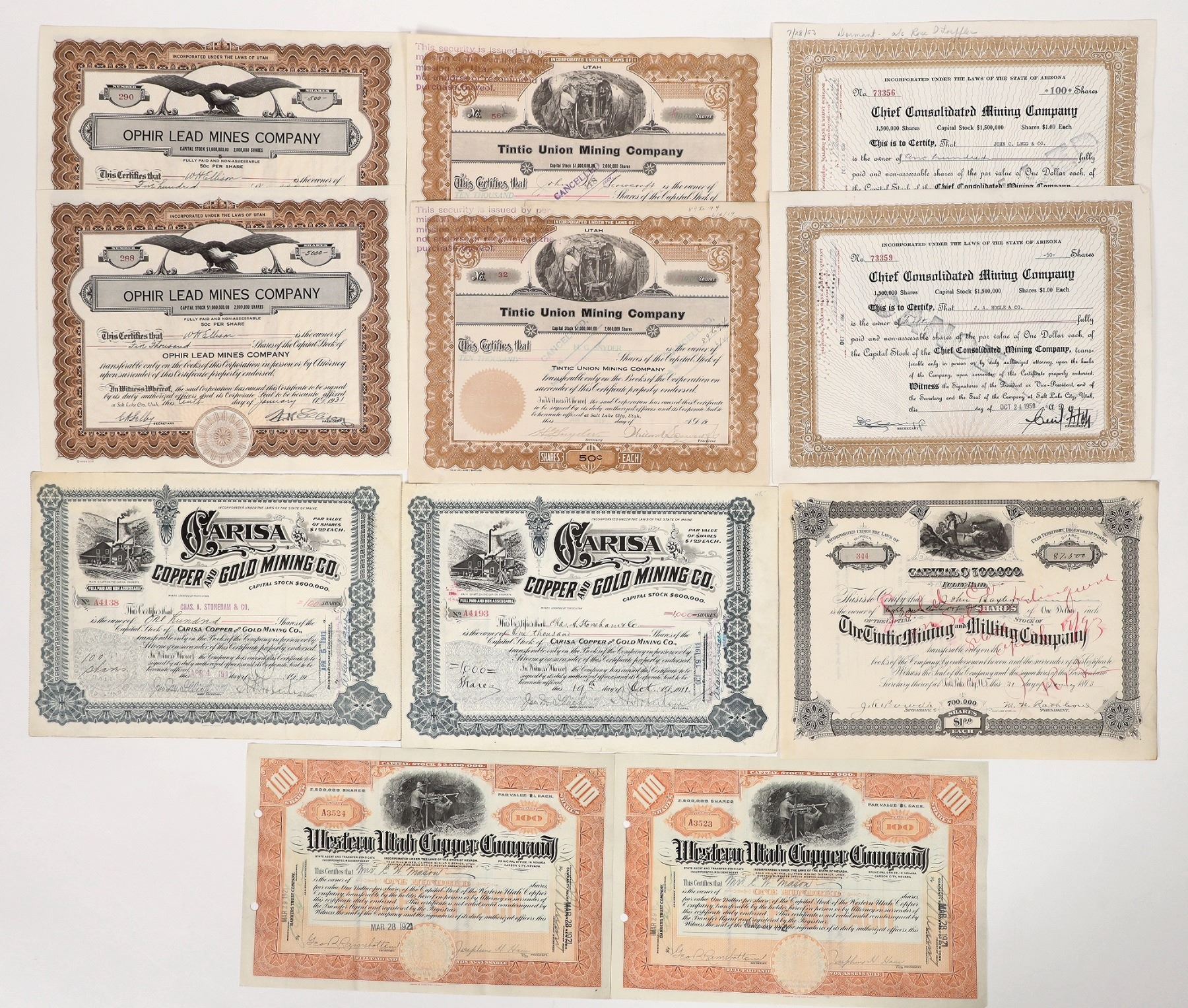 Issued 2x 1950 Chief Cons. Mining, 2x 1919 Tintic Union, 2x 1931 Ophir Lead, 2x 1921 Western Utah Copper, 1x 1893 Tintic Mining and Milling, 2x 1911 Carisa Copper and Gold.