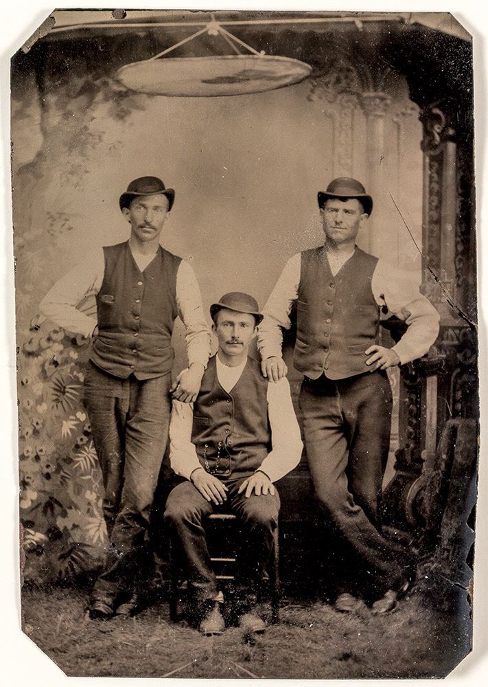 Early photograph (ferrotype, aka tintype) of three western gents all dressed in similar way. All are wearing vests and derby hats. Maybe taken in the back of the saloon or card room. We can only speculate. Cheesy looking flowered wallpaper at left. Crease across top right corner to the right of gent #3. Rare image. Probably early 1860's. City: State: Date: 1860's hwac# 35441