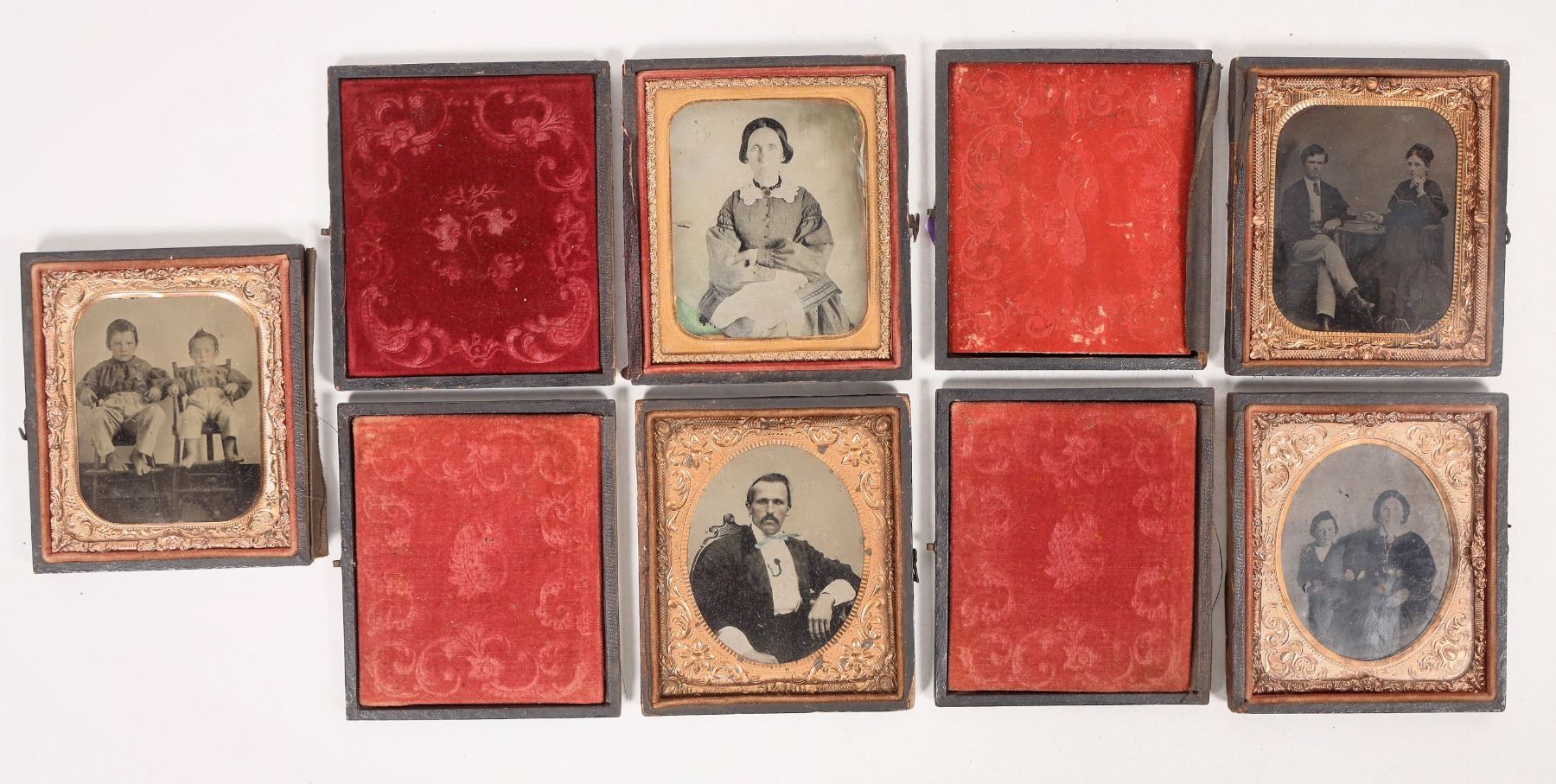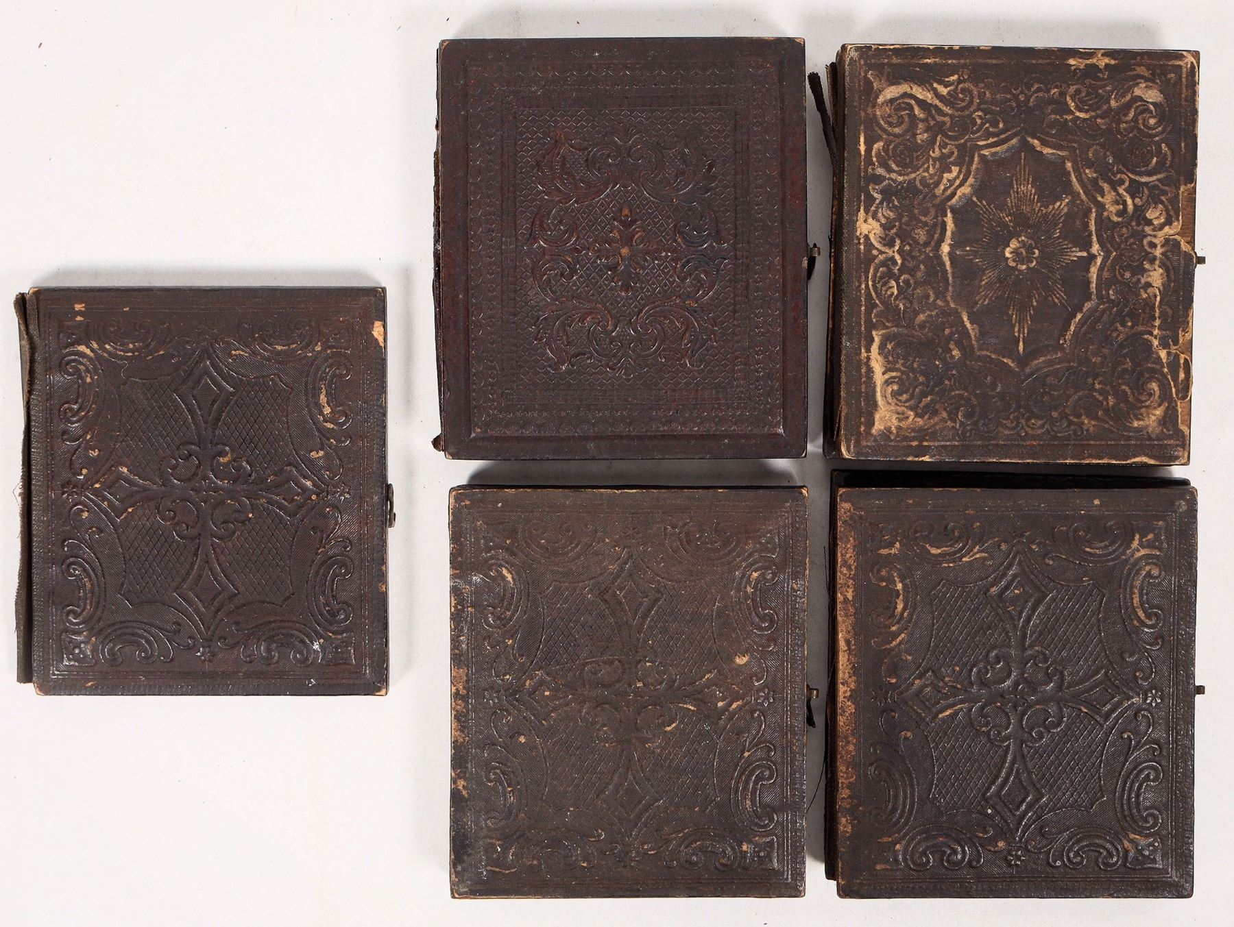 Collection of 5 tintypes and ambrotypes, 1/4 plate, cased, c1854-60. Includes 3 tintypes and 2 ambrotypes of men, women and children. Photographs are approximately 2.5" x 3". Wooden cases with leather coverings. Hinges are broken. 1 ambrotype missing front of case.