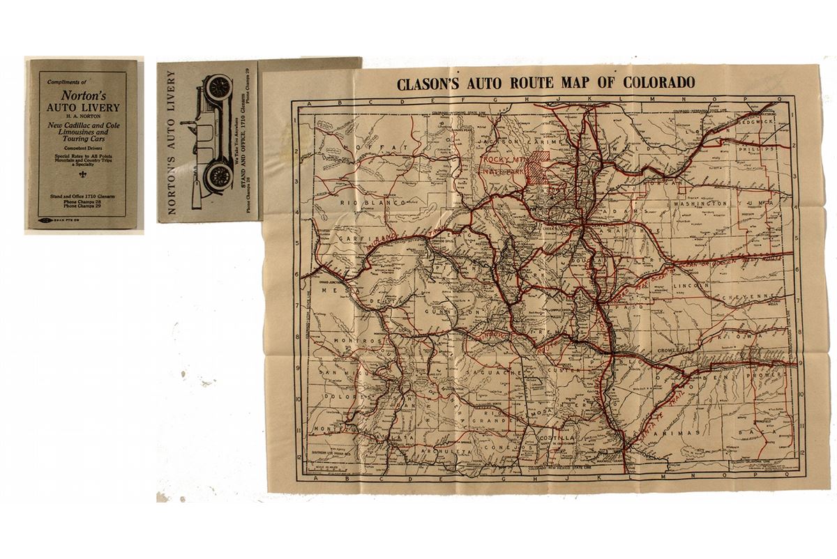Very cute! Clason's Auto Route Map of Colorado. 9" x 11.75" Compliments of Norton's Auto Livery in Denver. c.1920. Very good condition. 3.5" x 2.5"
