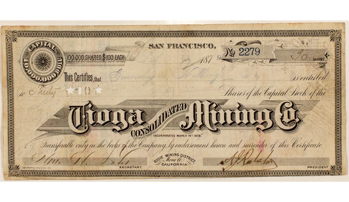 Bodie, CA. Number 2279 for 30 shares issued to Willing Company, trustees. Signed by secretary William H. Lent (of Lent Shaft fame in Bodie) and president A. J. Ralston. 12 assessment stamps on back. No vignette, company name ornately presented. Black border and print. U/C. Lith. Britton, Rey & Co., S.F. At least 12 paid assessment stamps also visible. This company was one of many in which Henry M. Yerington was involved. Ralston was also associated with the Web Foot in Elko, Nevada and the Junita in Esmeralda, Nevada among others.City: BodieCounty: Mono State: CADate: 1879